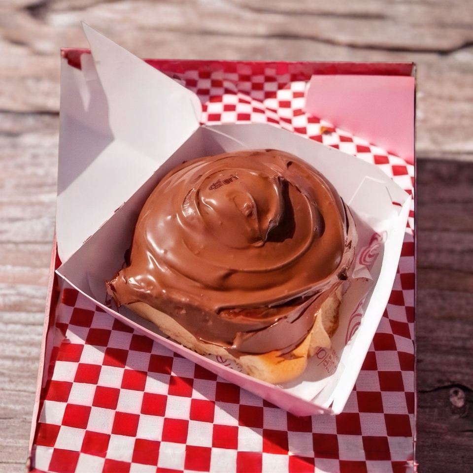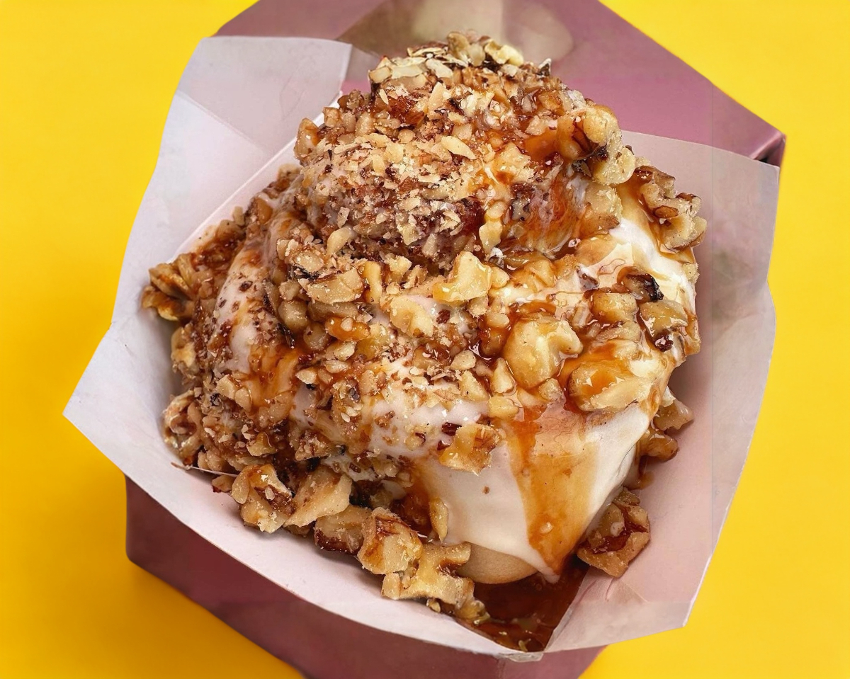Roll de canela con nuestro delicioso betún de queso crema miel de Maple y tocino crujiente
