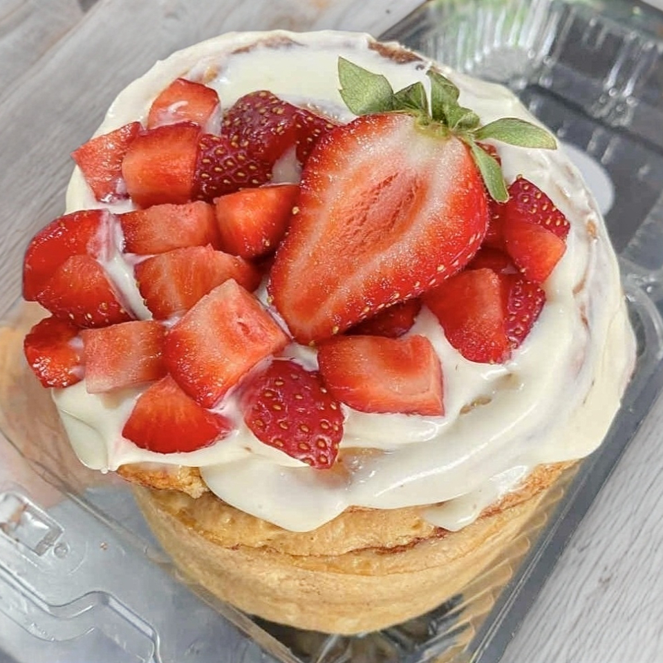 Suave y esponjoso roll relleno de mantequilla y canela, topping de queso crema y fresas frescas