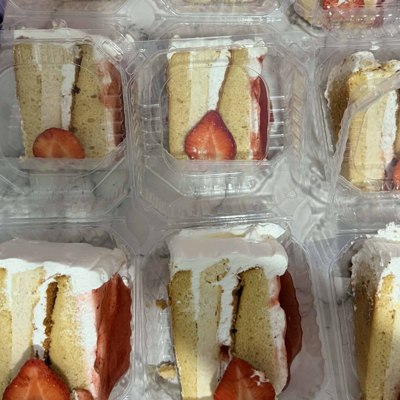 Rebanada de pastel húmedo en 3 leches con rellle de pay de queso y mermelada de fresa