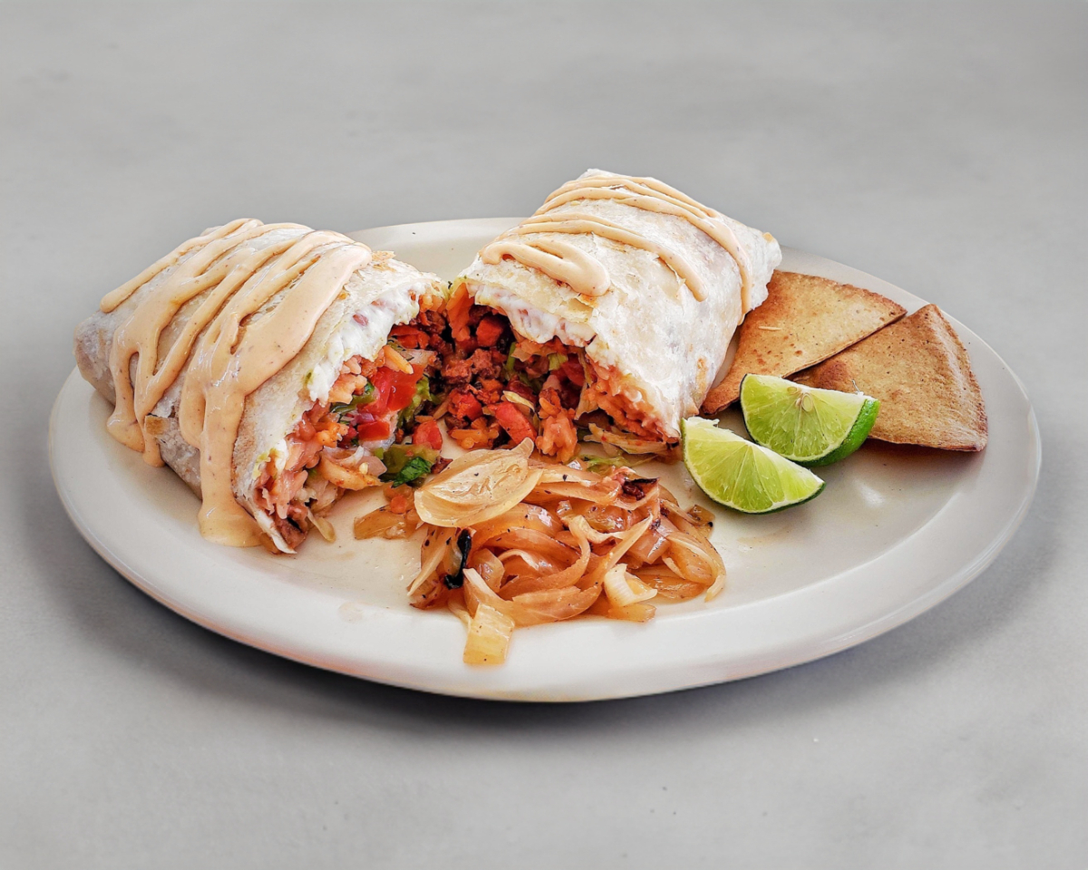 Burrito de tortilla de harina que su interior contiene queso asadero, arroz, ensalada mexicana, y camaron. Todo preparado a la planca.