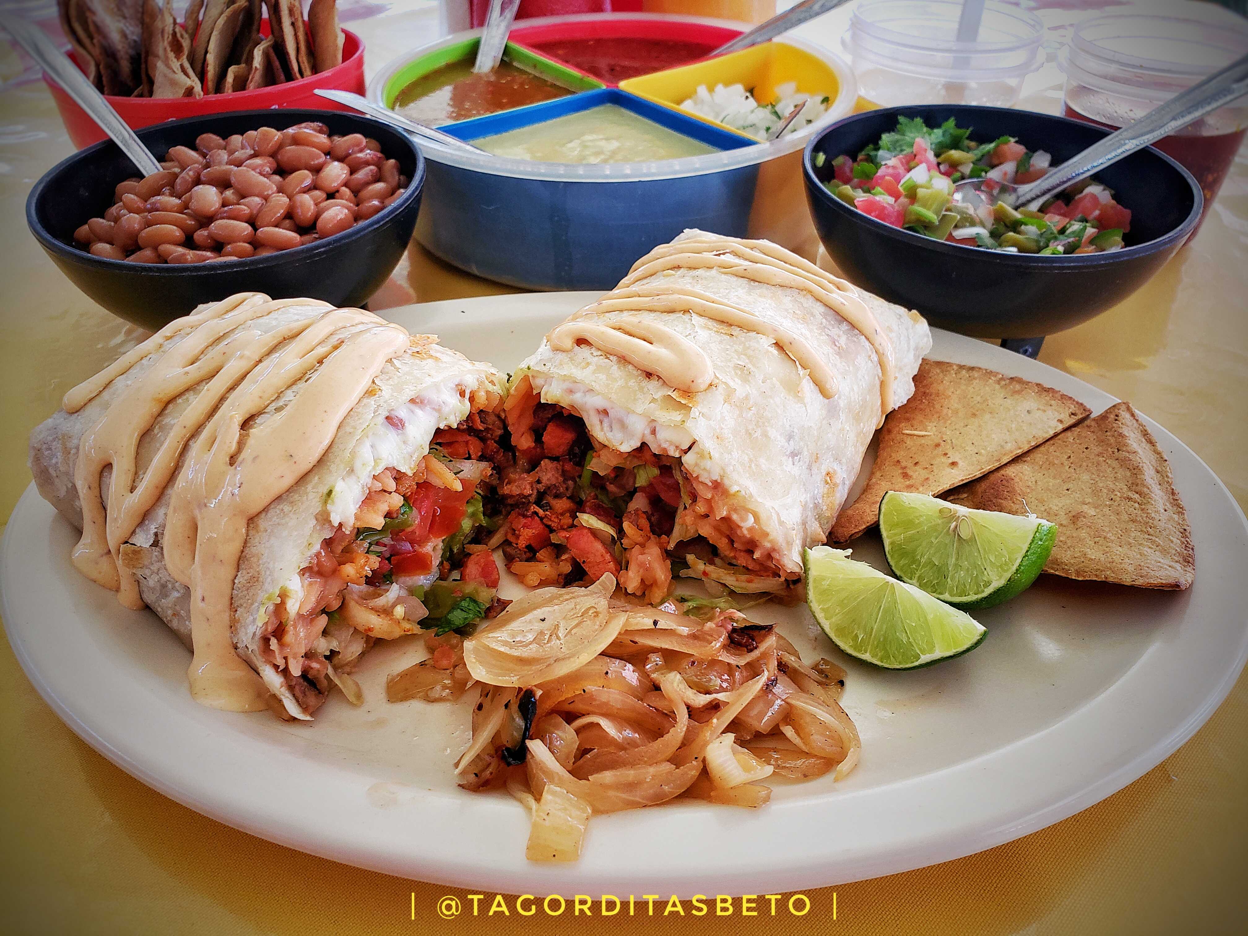 Burrito relleno con carne a su eleccion, frijoles, arroz, queso asadero, lechuga, ensalada mexicana y crema.