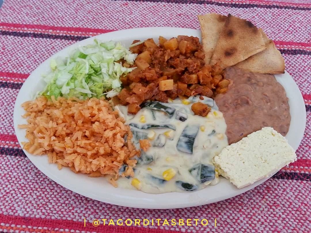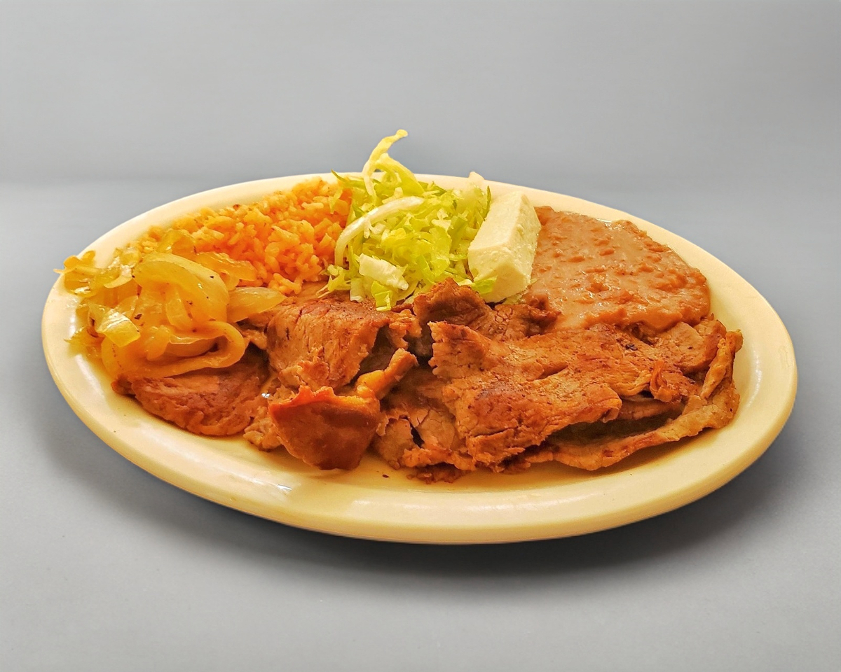 Acompañado de frijoles, arroz, lechuga, queso fresco y 3 tortillas grandes hechas a mano.