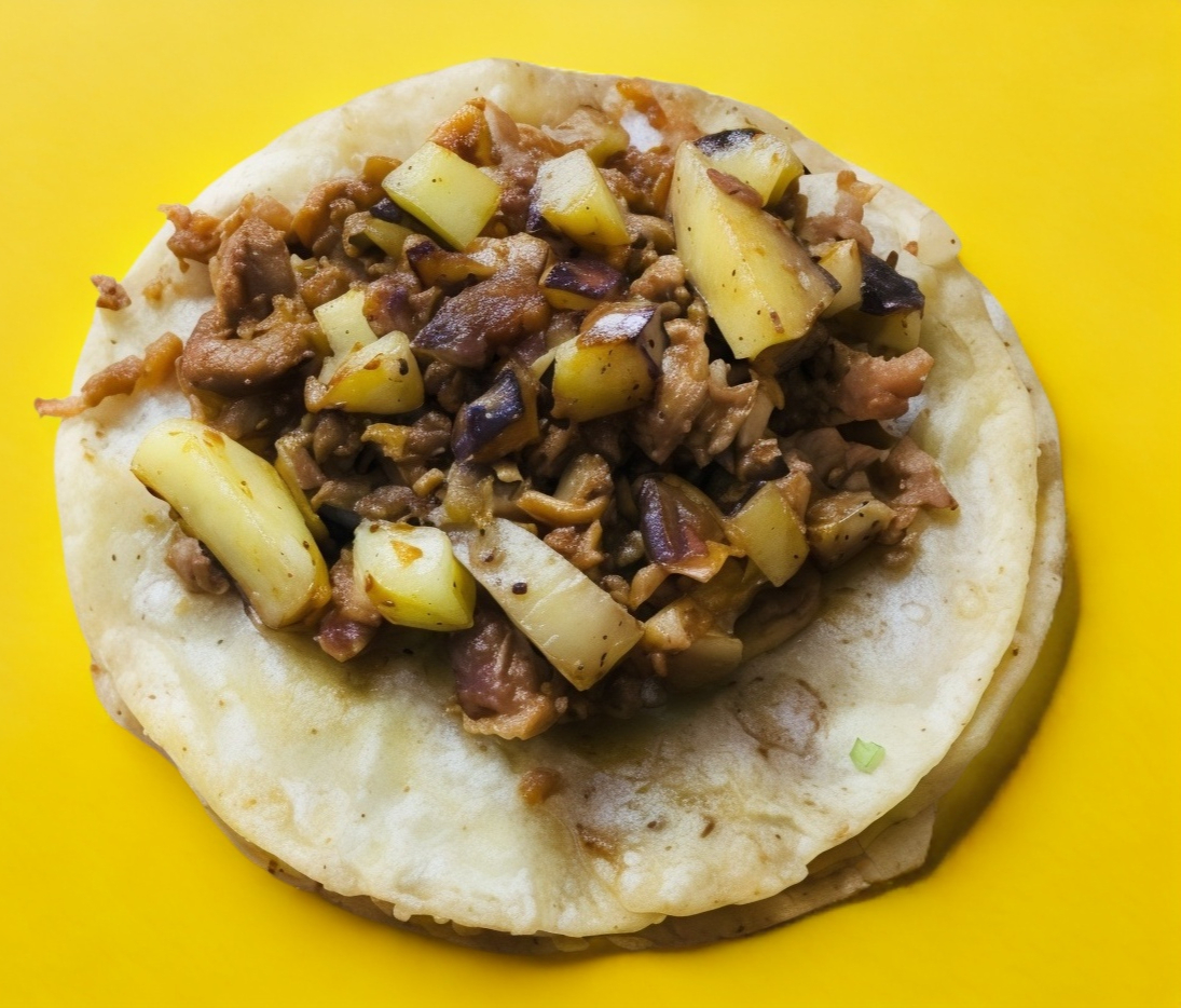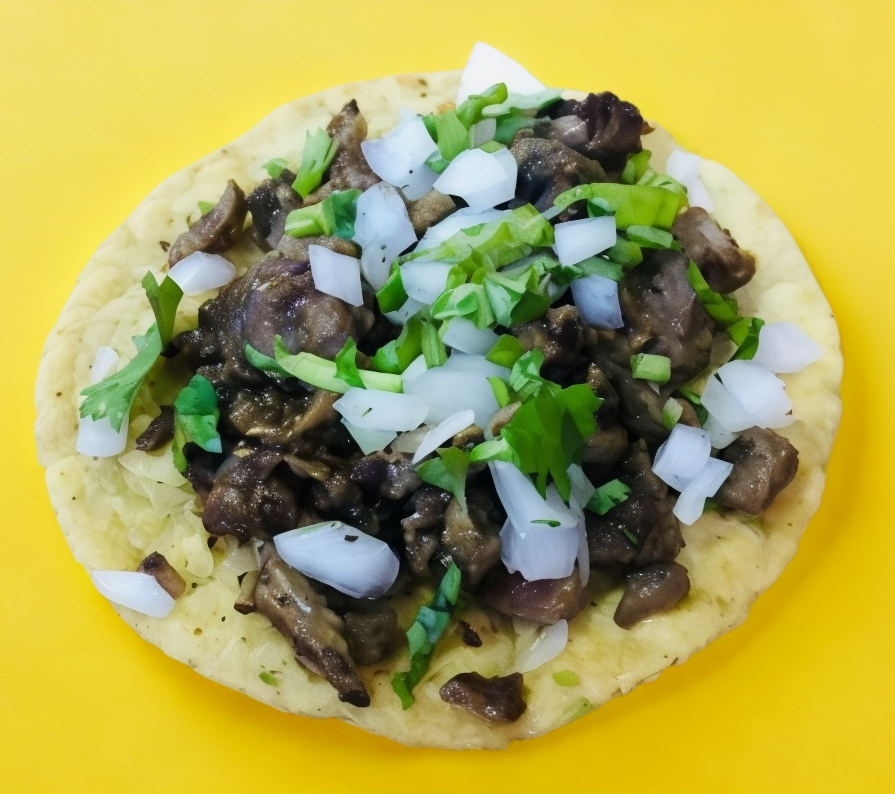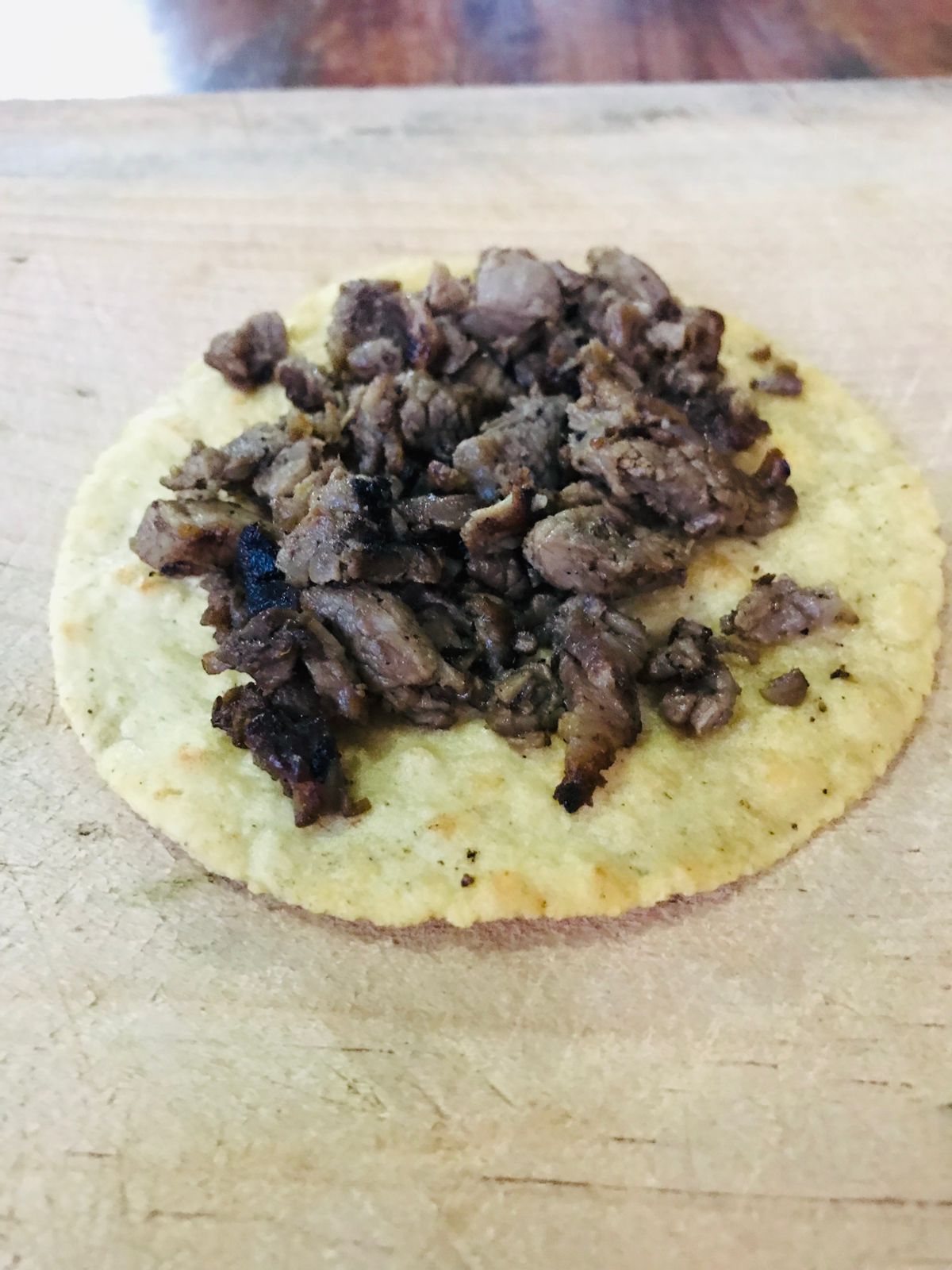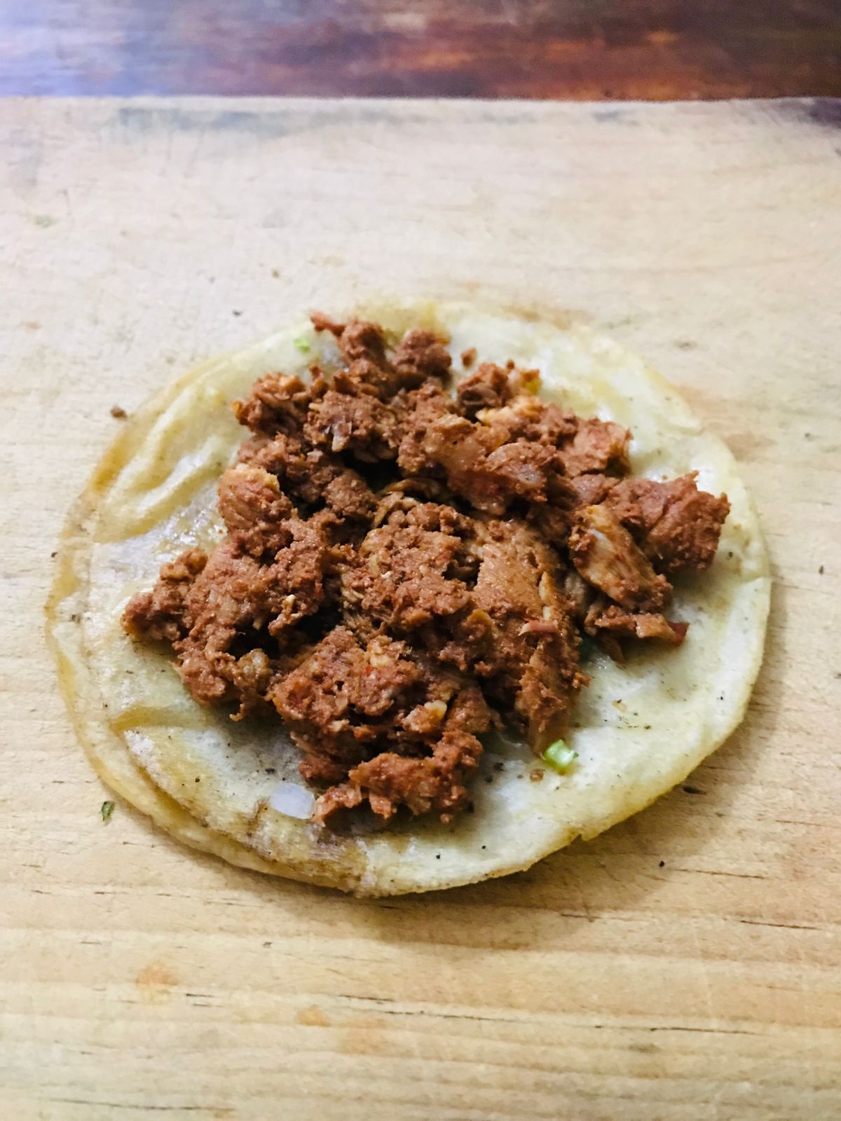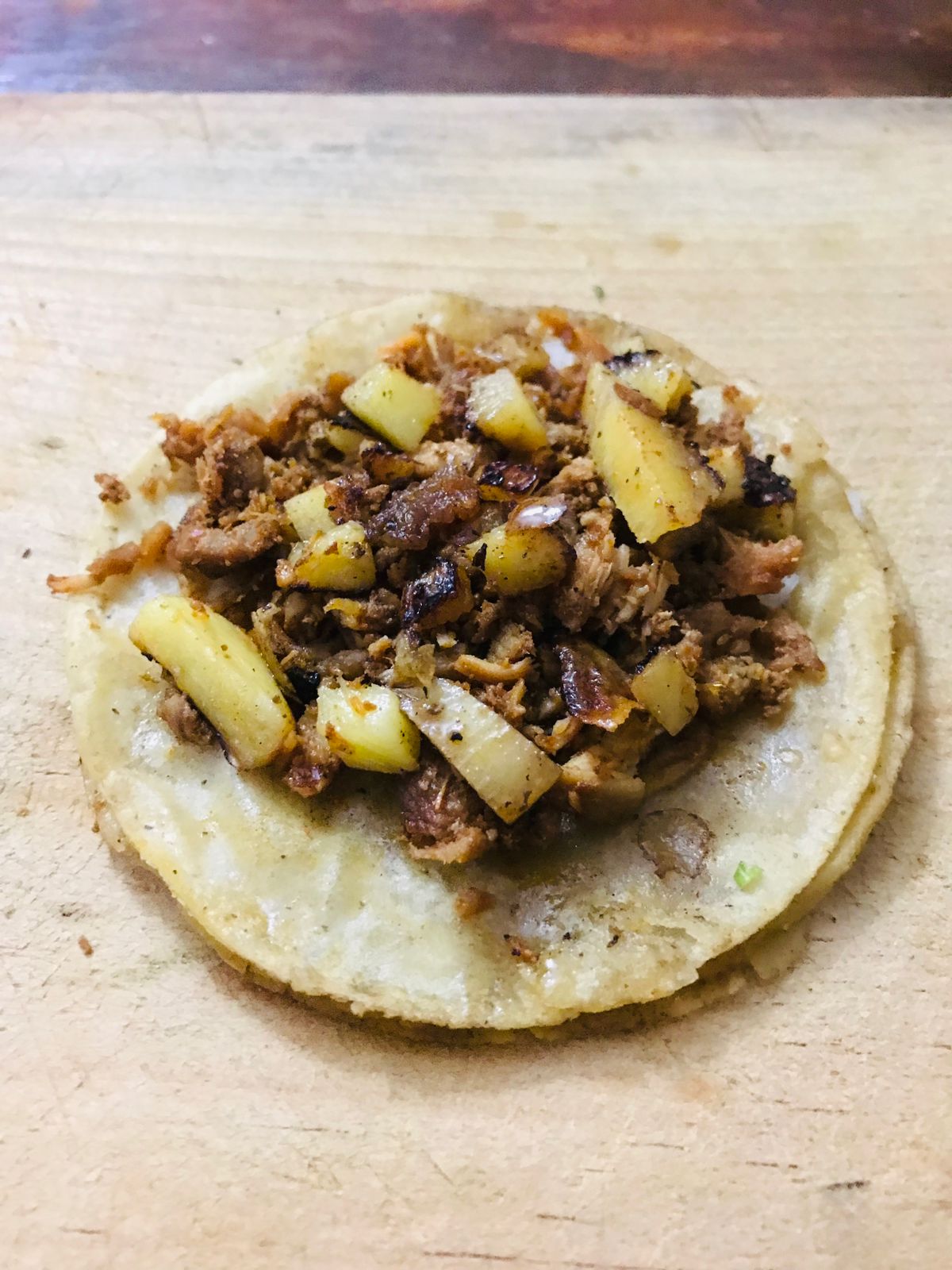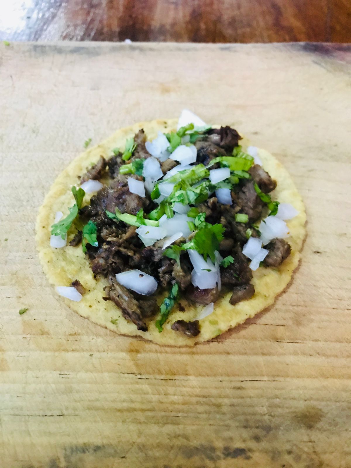 tortilla doble, asada con adobada y verduras por aparte. Con mayonesa, queso y aderezo de cilantro