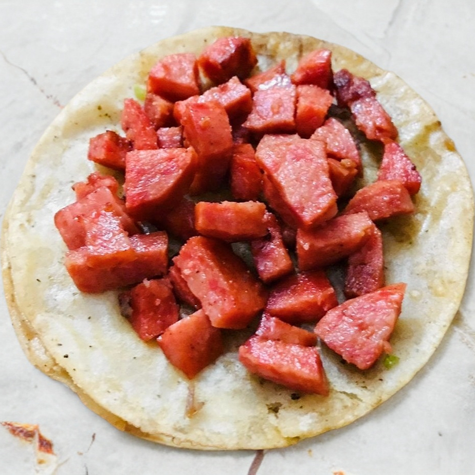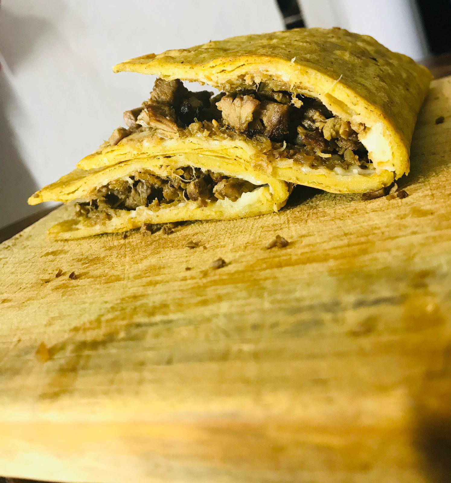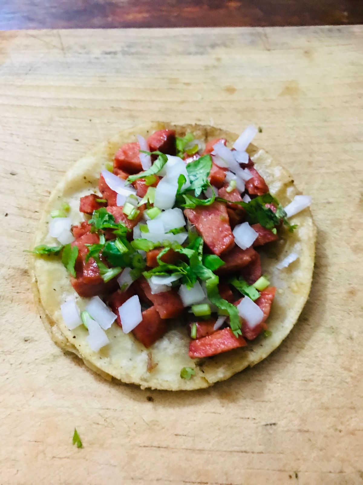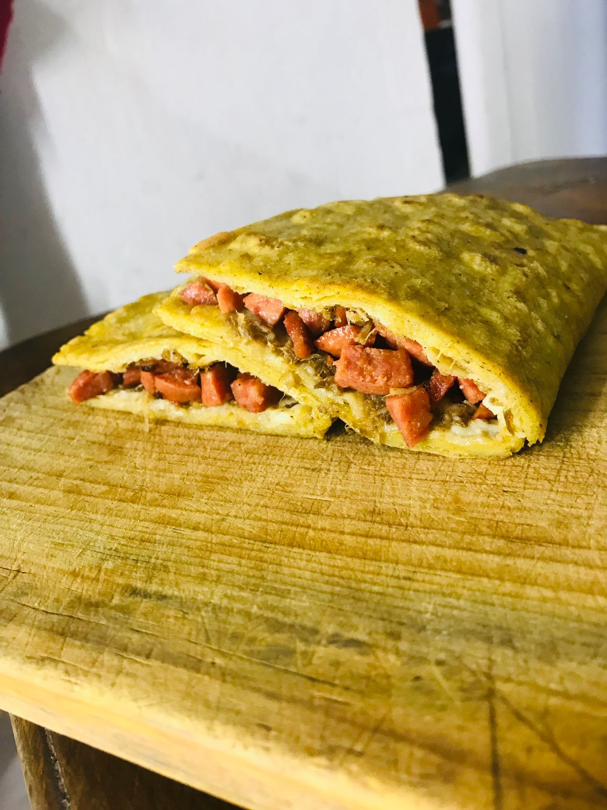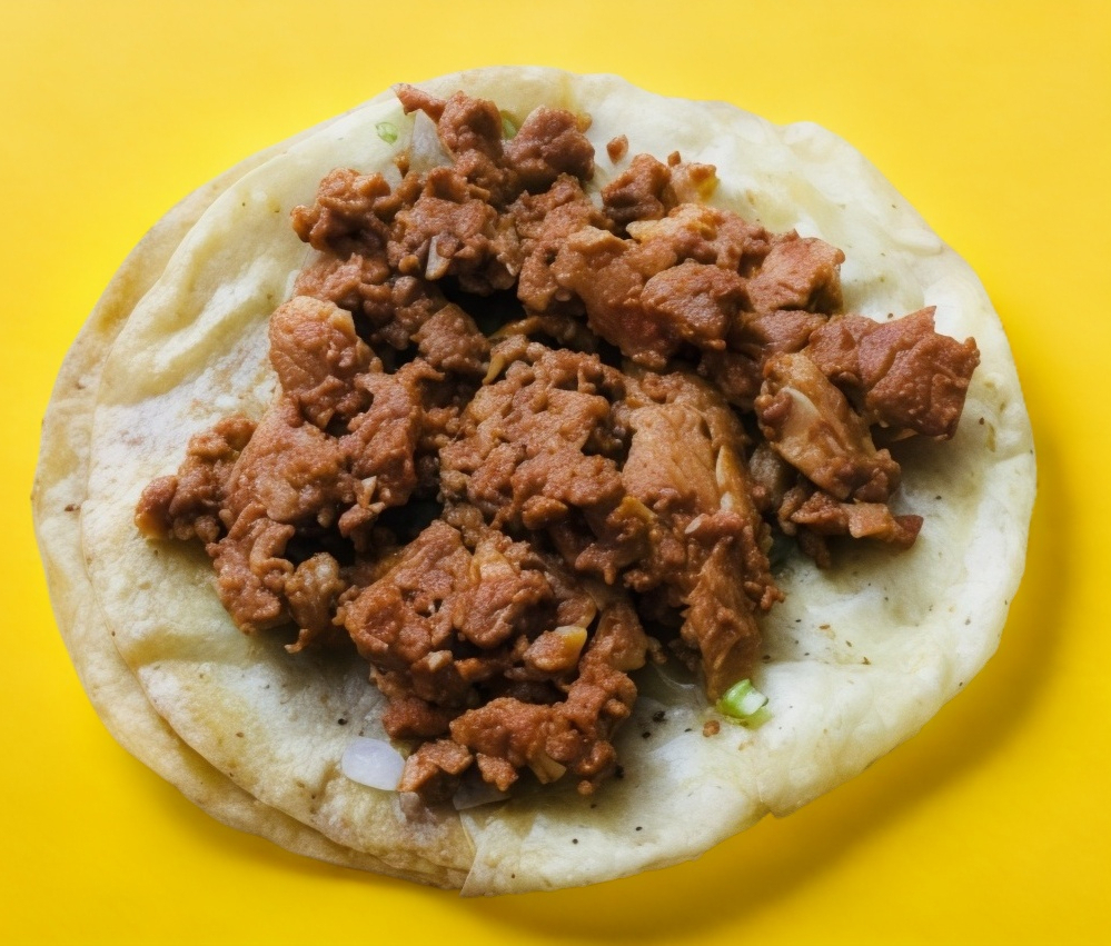tortilla doble, asada con adobada y verduras por aparte. Con mayonesa, queso y aderezo de cilantro