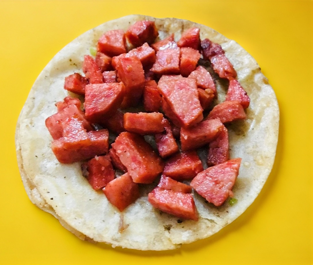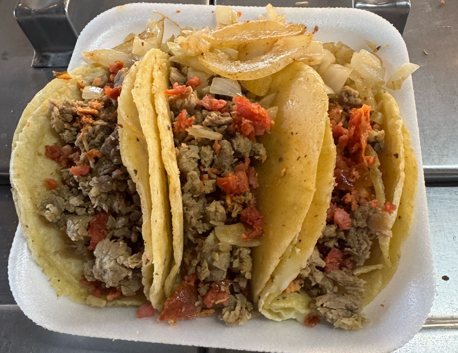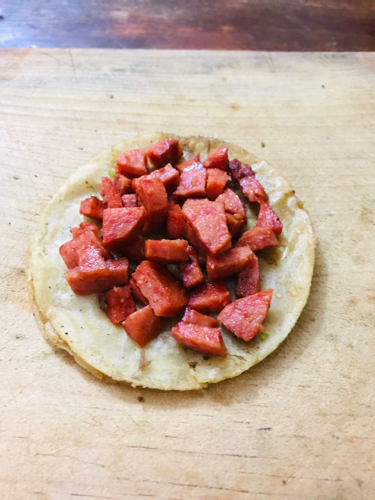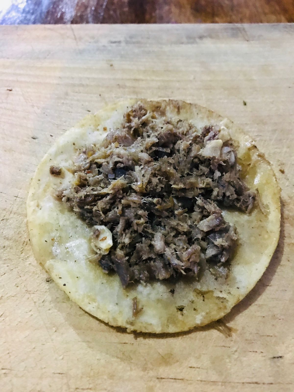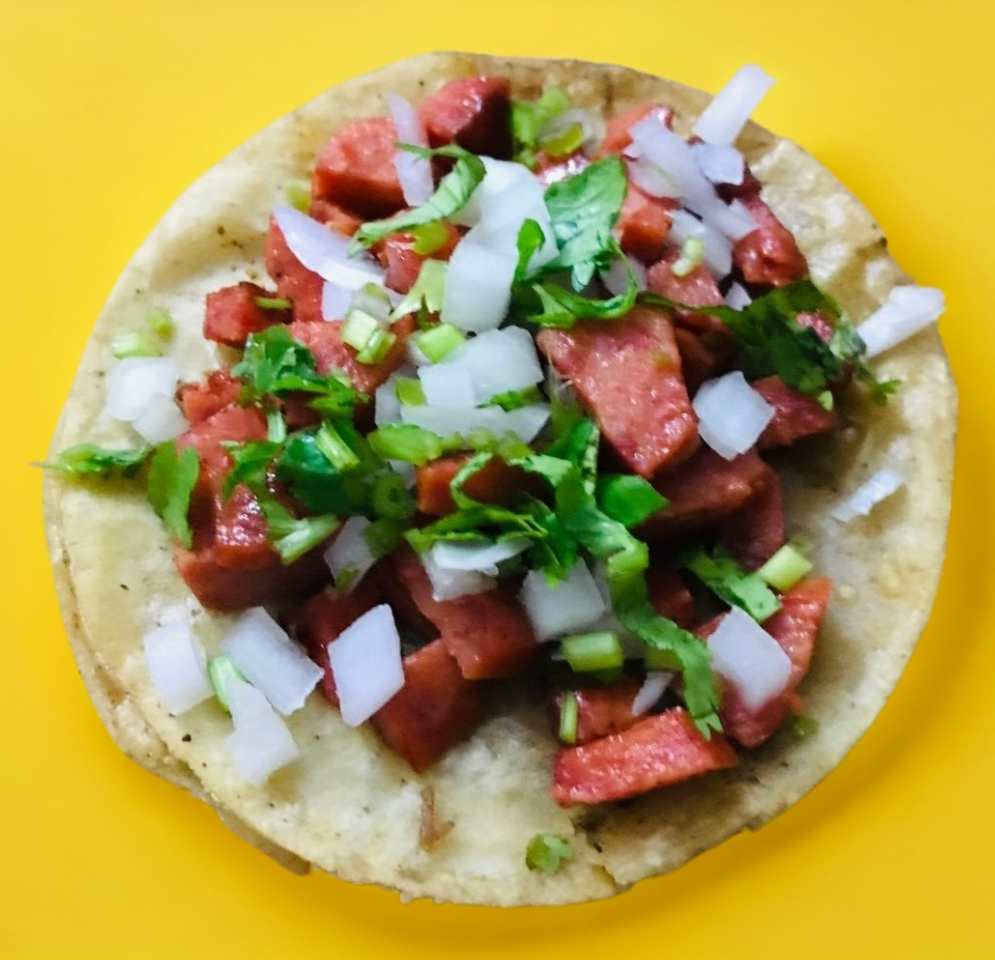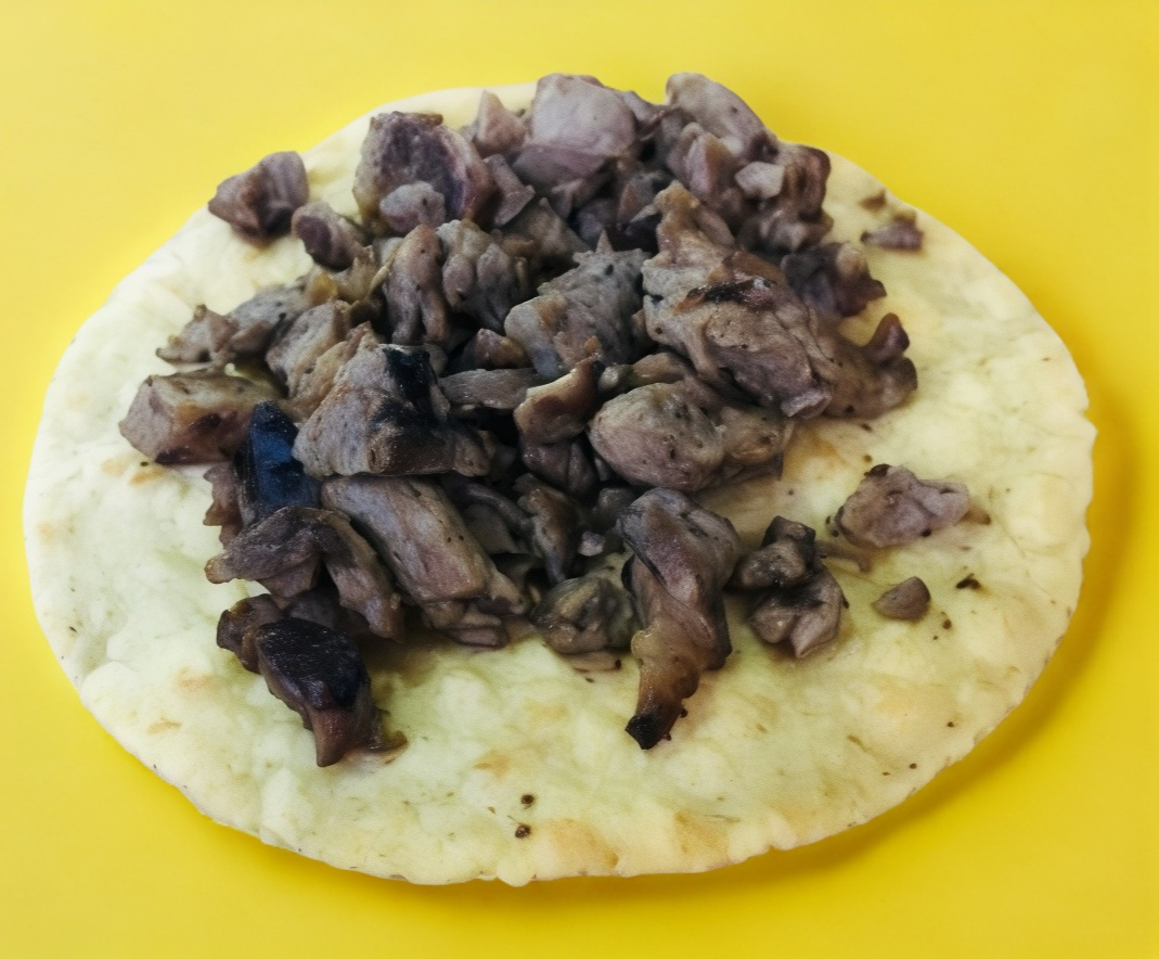 tortilla doble, asada con adobada y verduras por aparte. Con mayonesa, queso y aderezo de cilantro