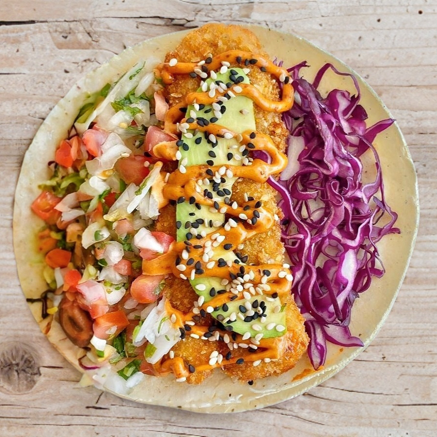 Gringa de Pescado Con col morado, salsa a la mexicana, aderezo de chipotle, ajonjolí y aguacate.