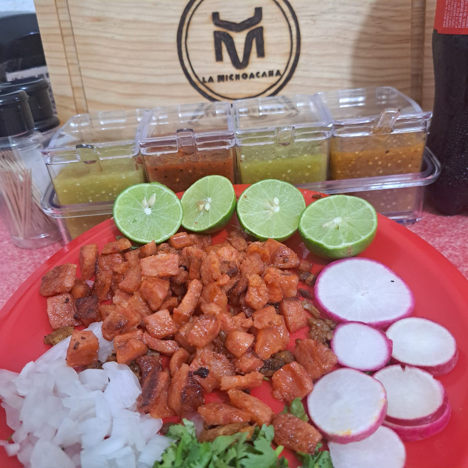 Incluye salsa roja y verde, cilantro, cebolla, lechuga, rábanos, frijoles y limón.