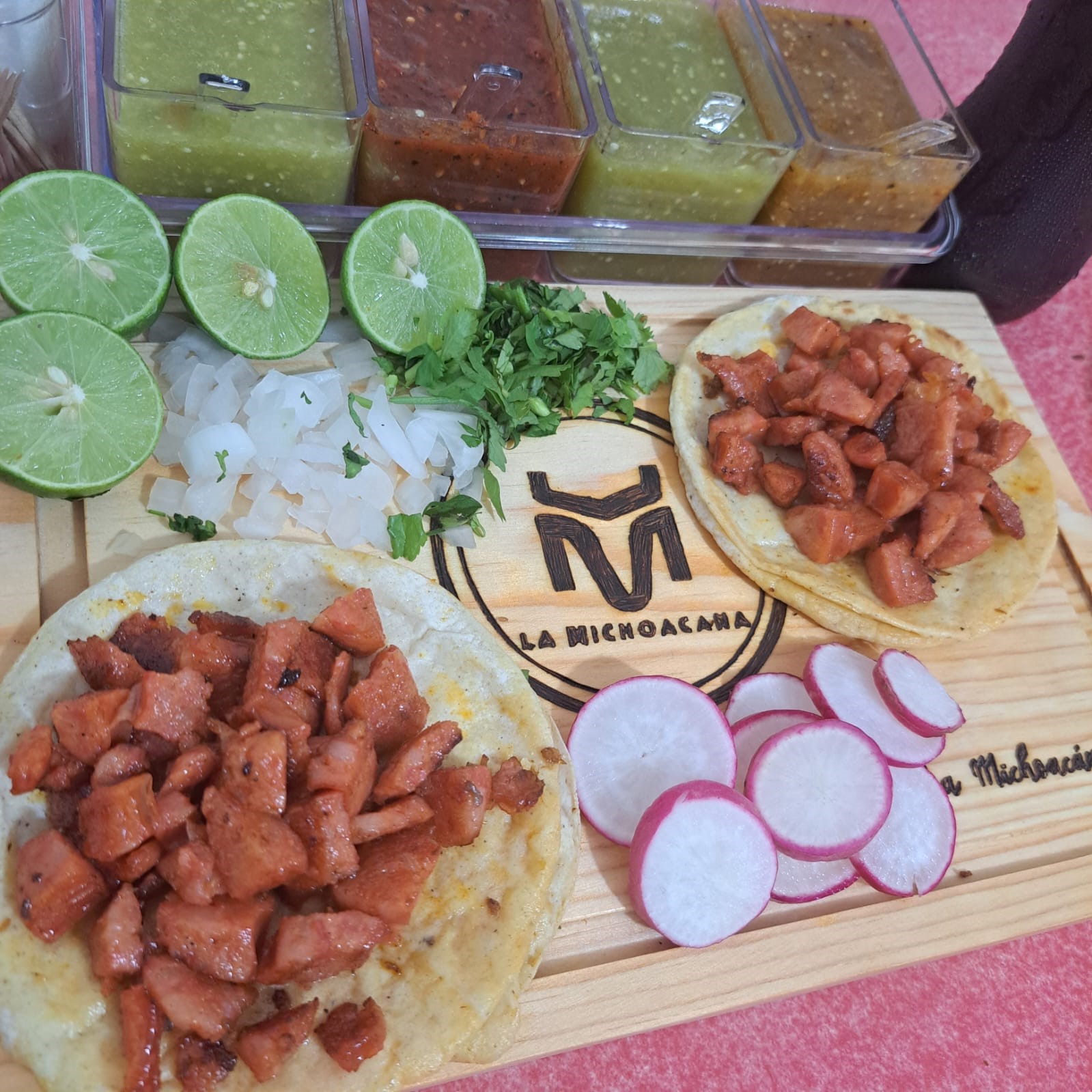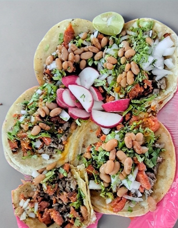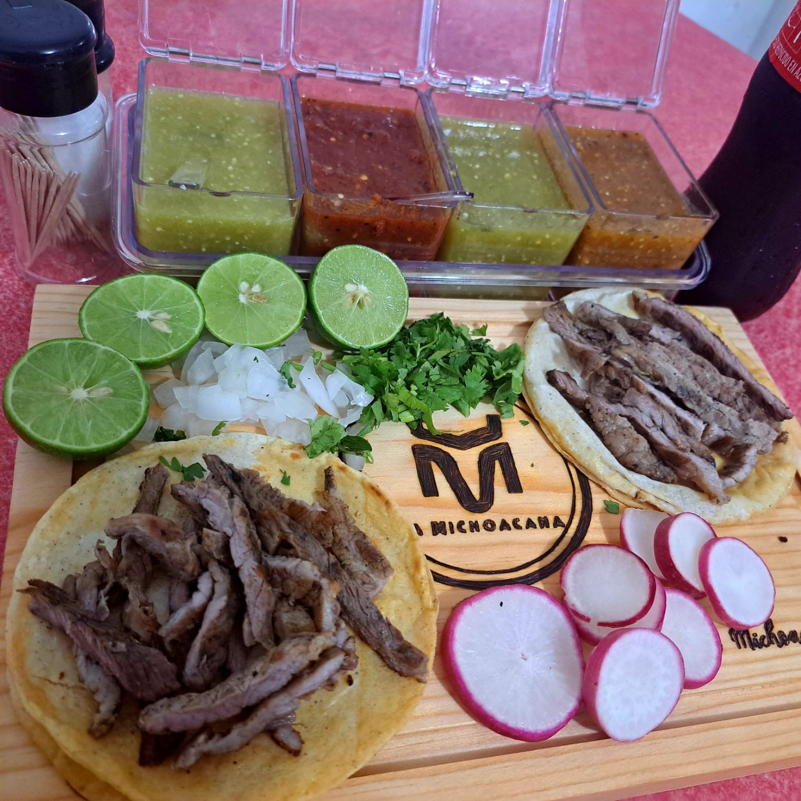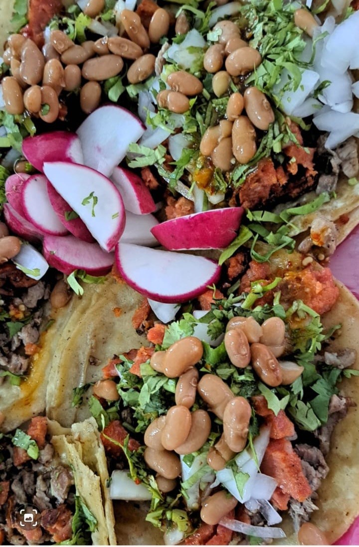 Carne a elegir: Incluye salsa roja y verde, cilantro, cebolla, lechuga, rábanos, frijoles, limón y tortillas.