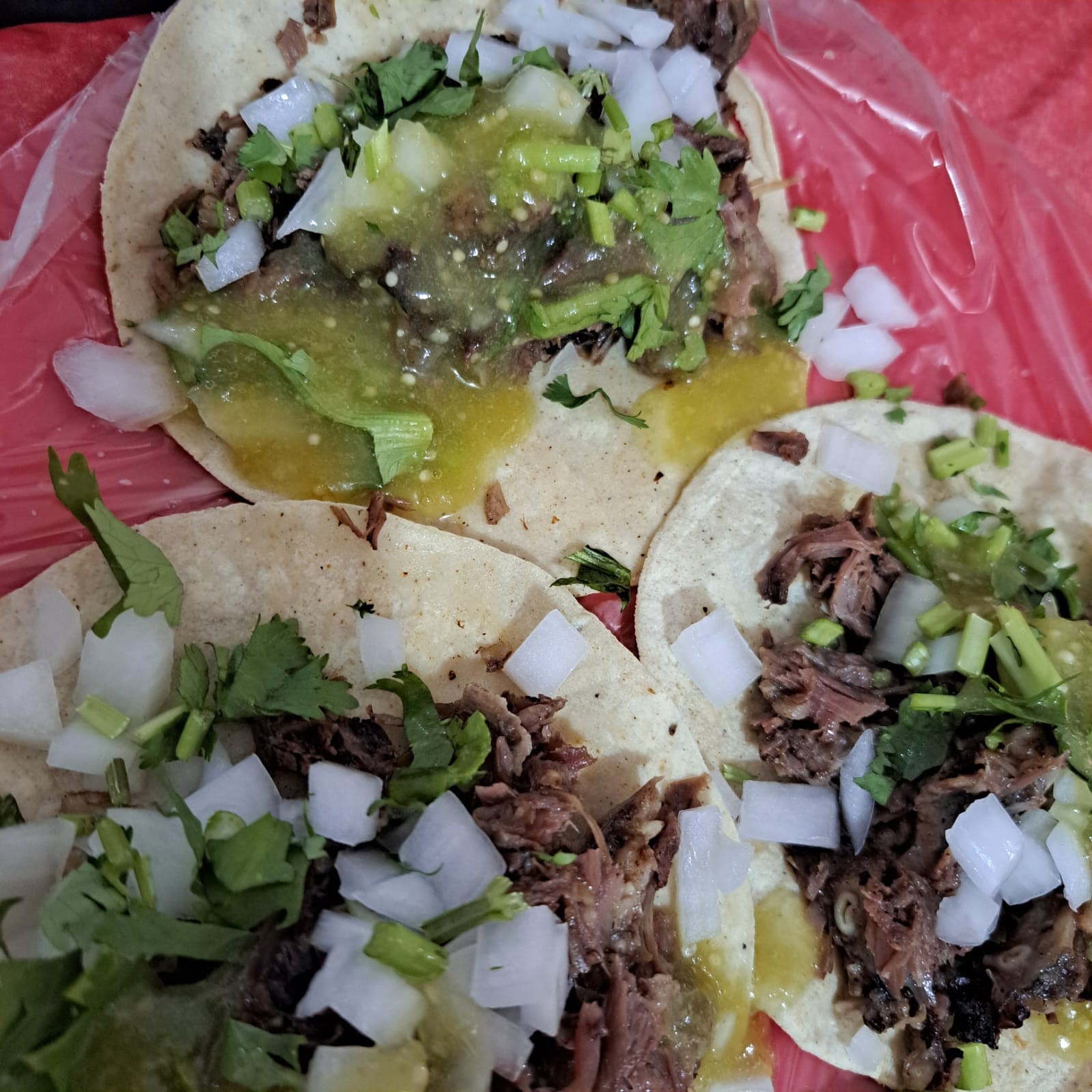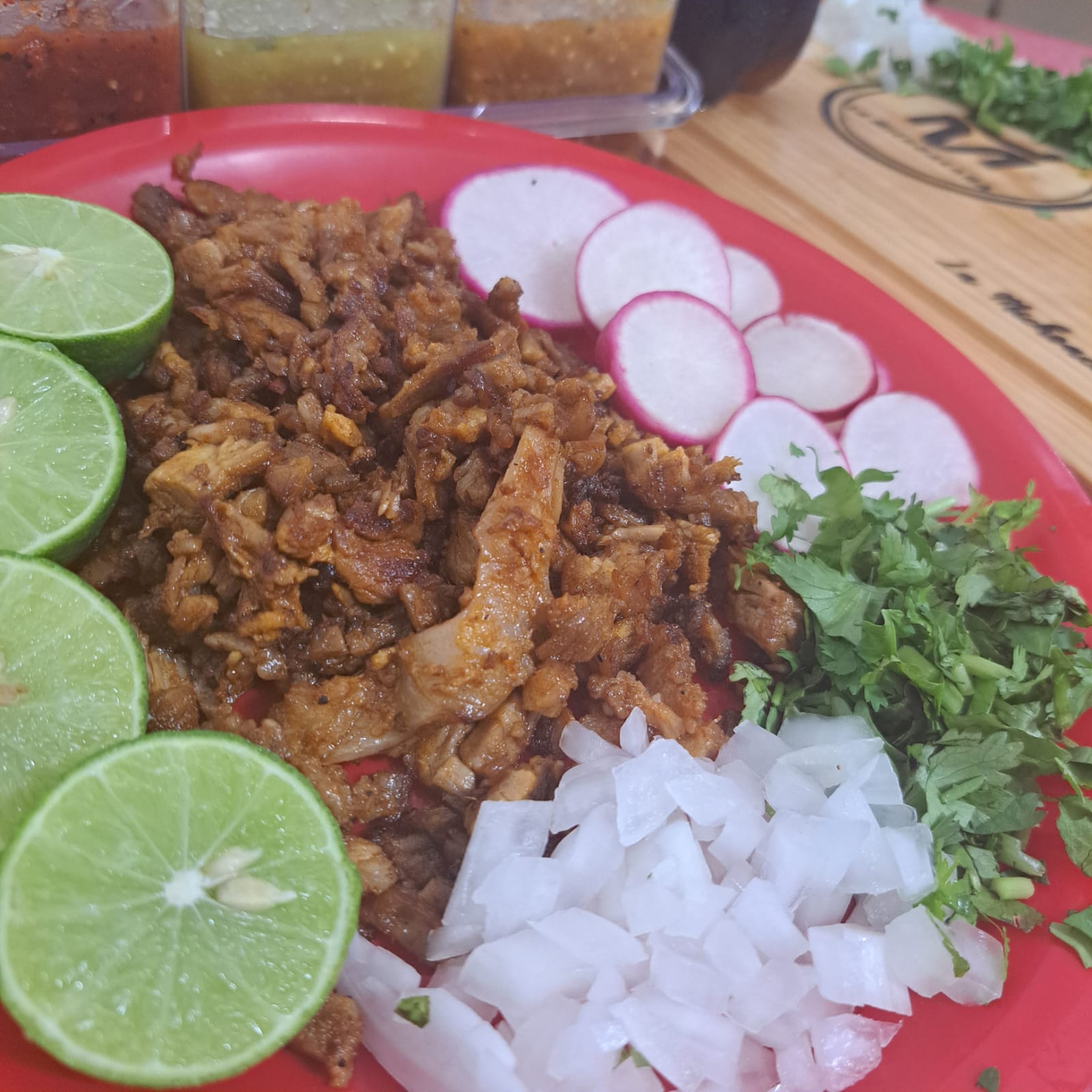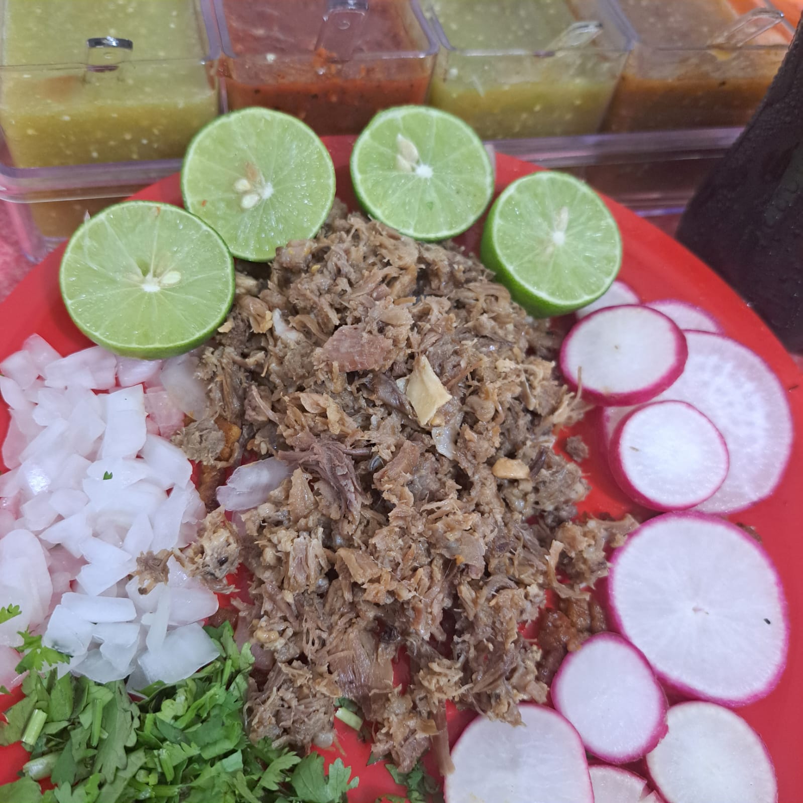 Carne a elegir: Incluye salsa roja y verde, cilantro, cebolla, lechuga, rábanos, frijoles, limón y tortillas.