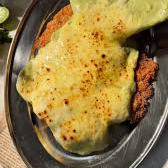 Milanesa de pollo, bañado en salsa suiza con queso gratinado