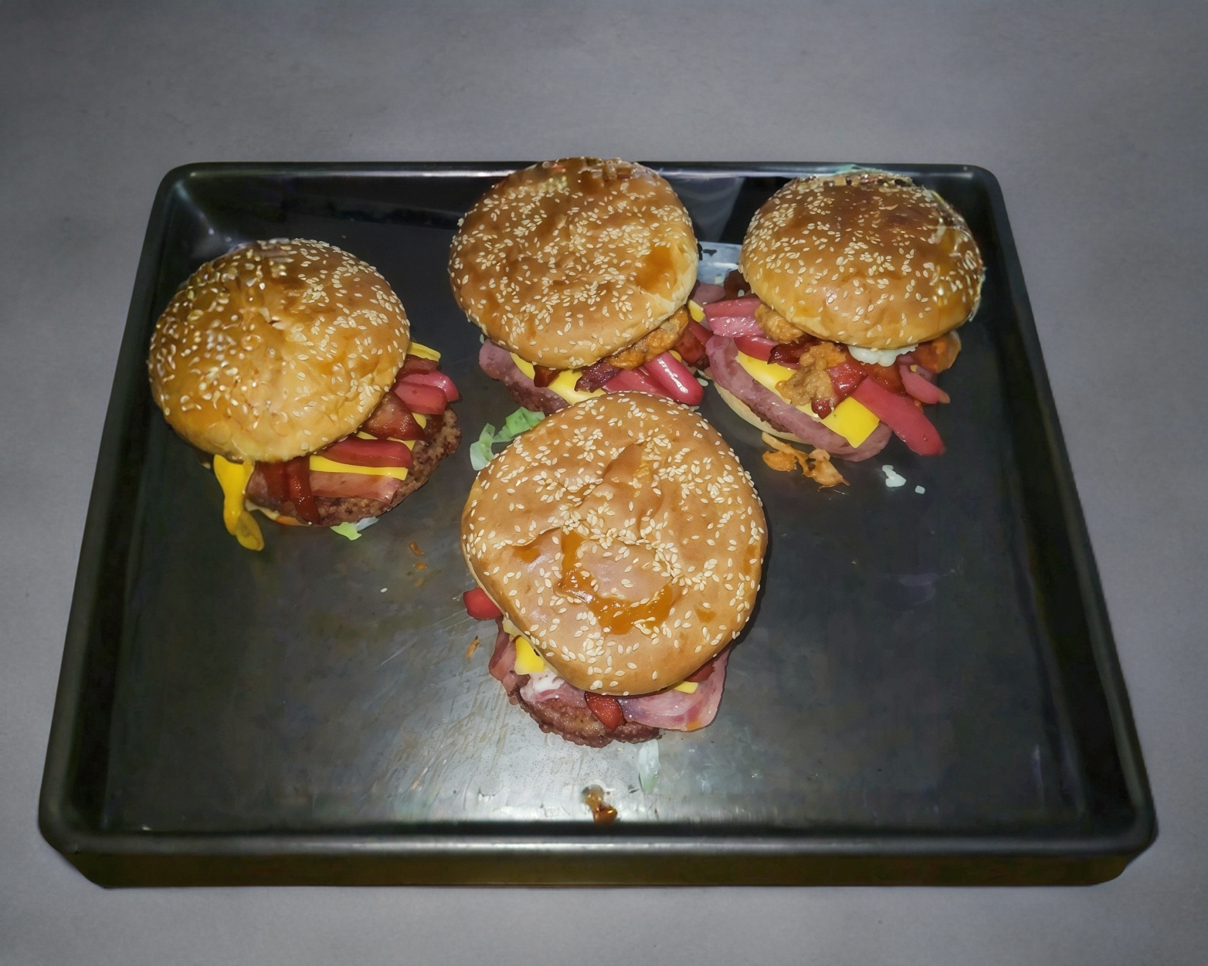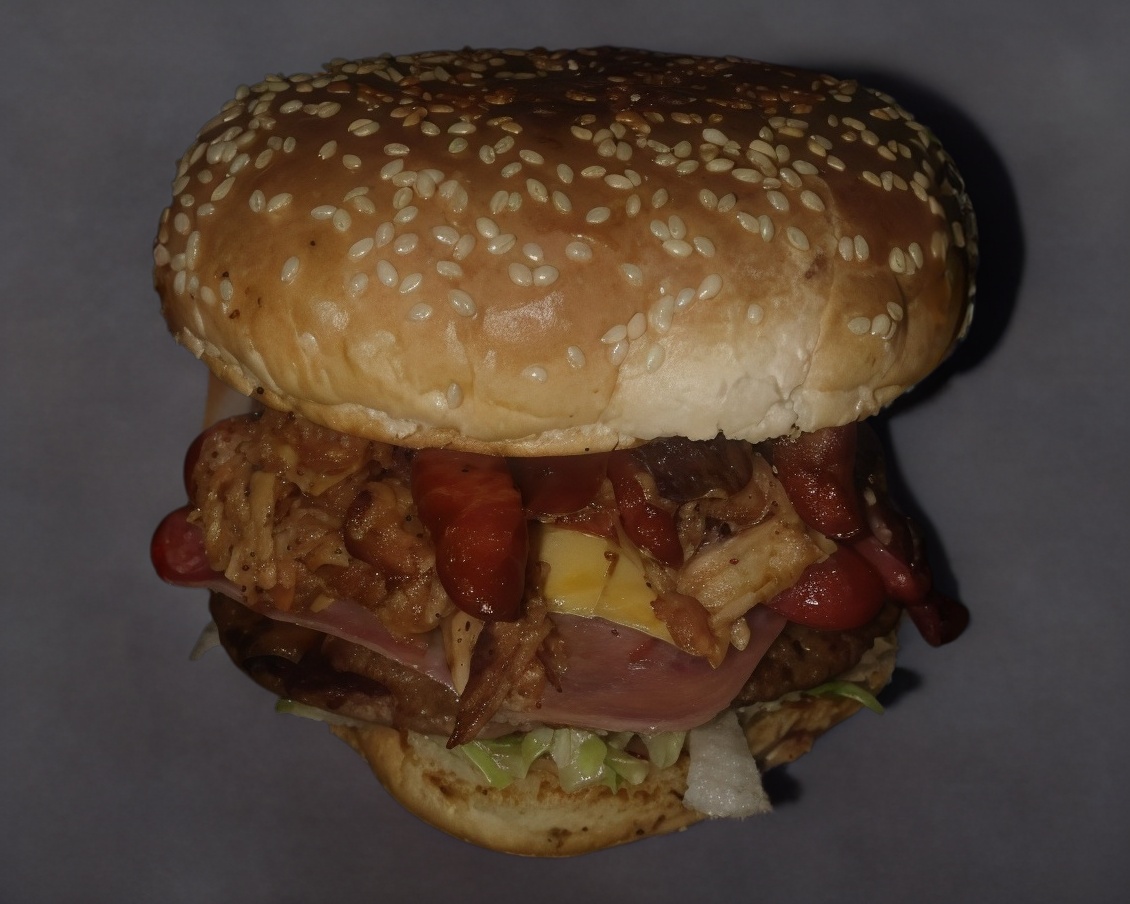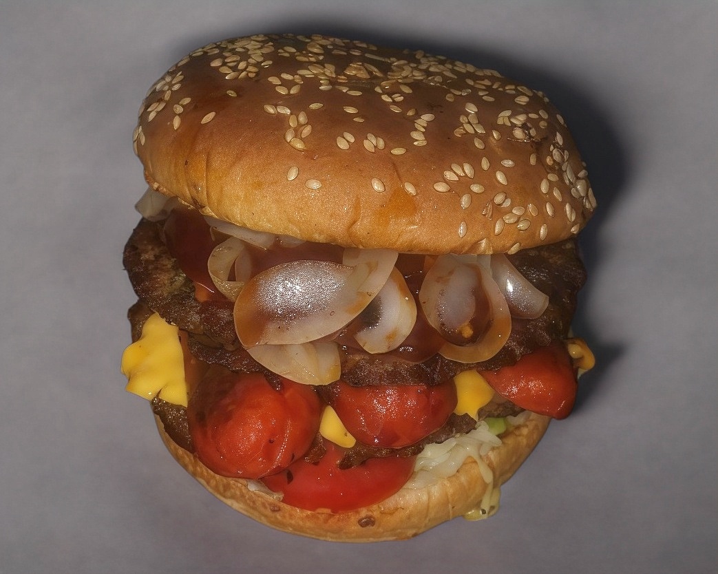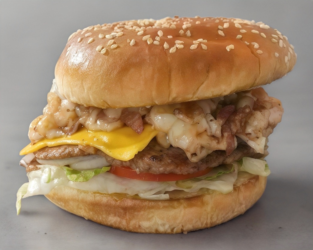 Doble carne, tocino, queso asadero, aros de cebolla y salsa BBQ.