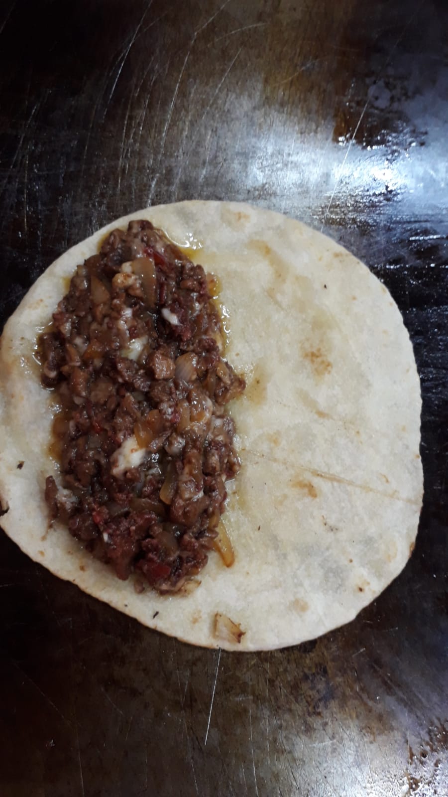 Bistec encebollado, queso asadero.