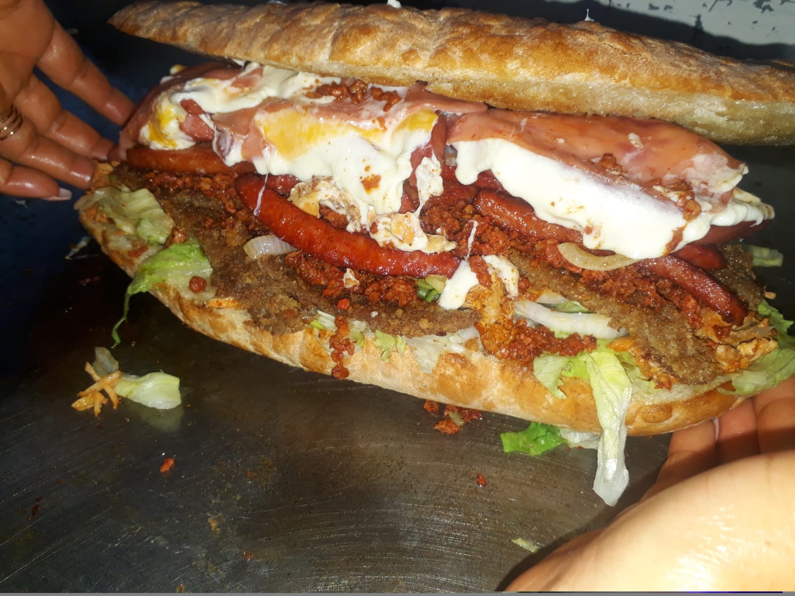 Carne, jamón, salchicha y queso asadero. Sin papas.