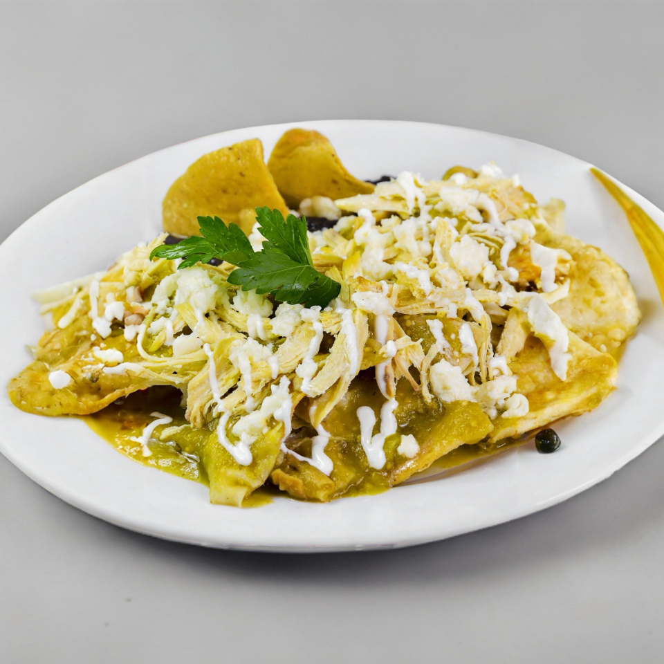 totopos bañados en salsa verde o roja con huevos revueltos o estrellados con crema, queso y cebolla