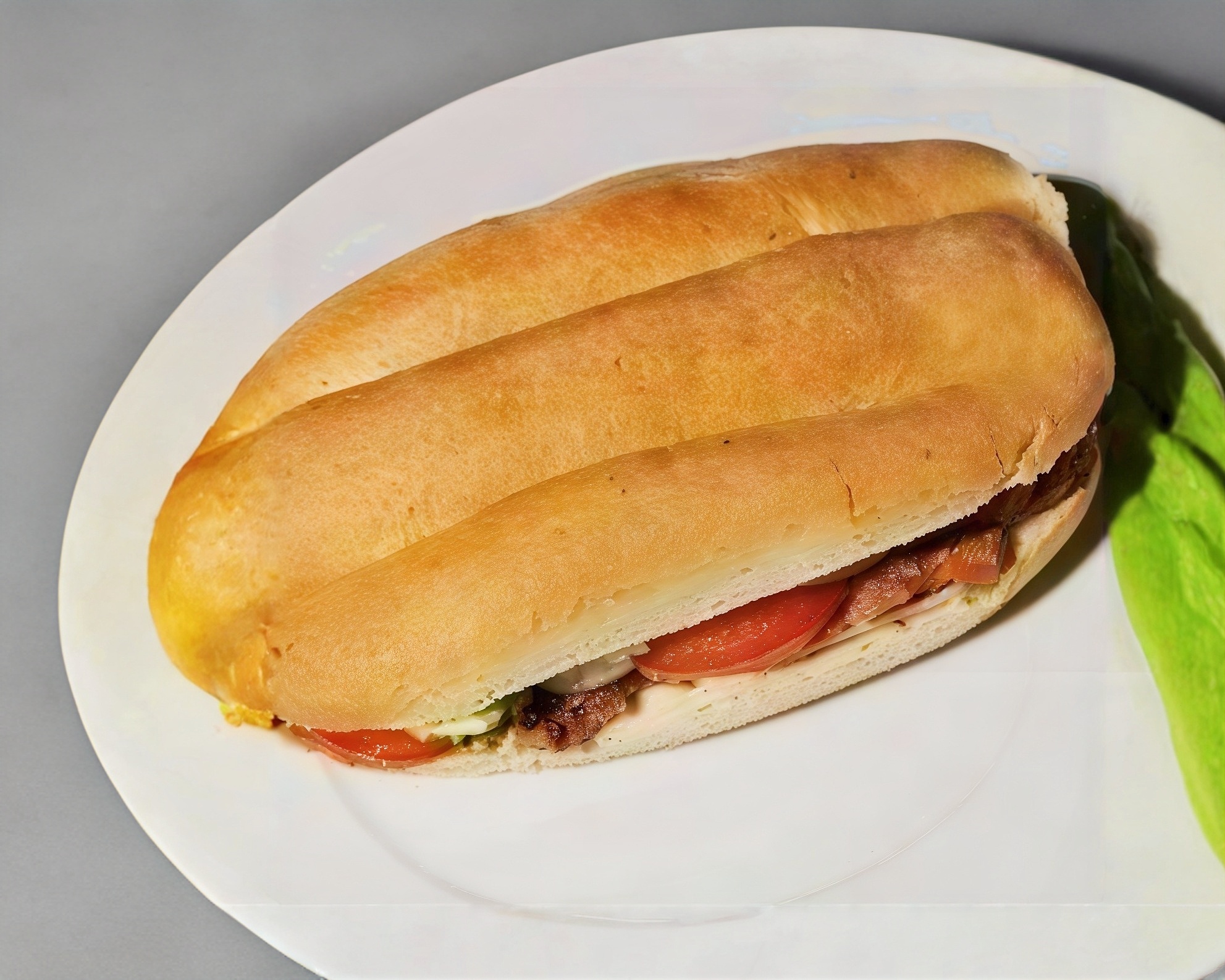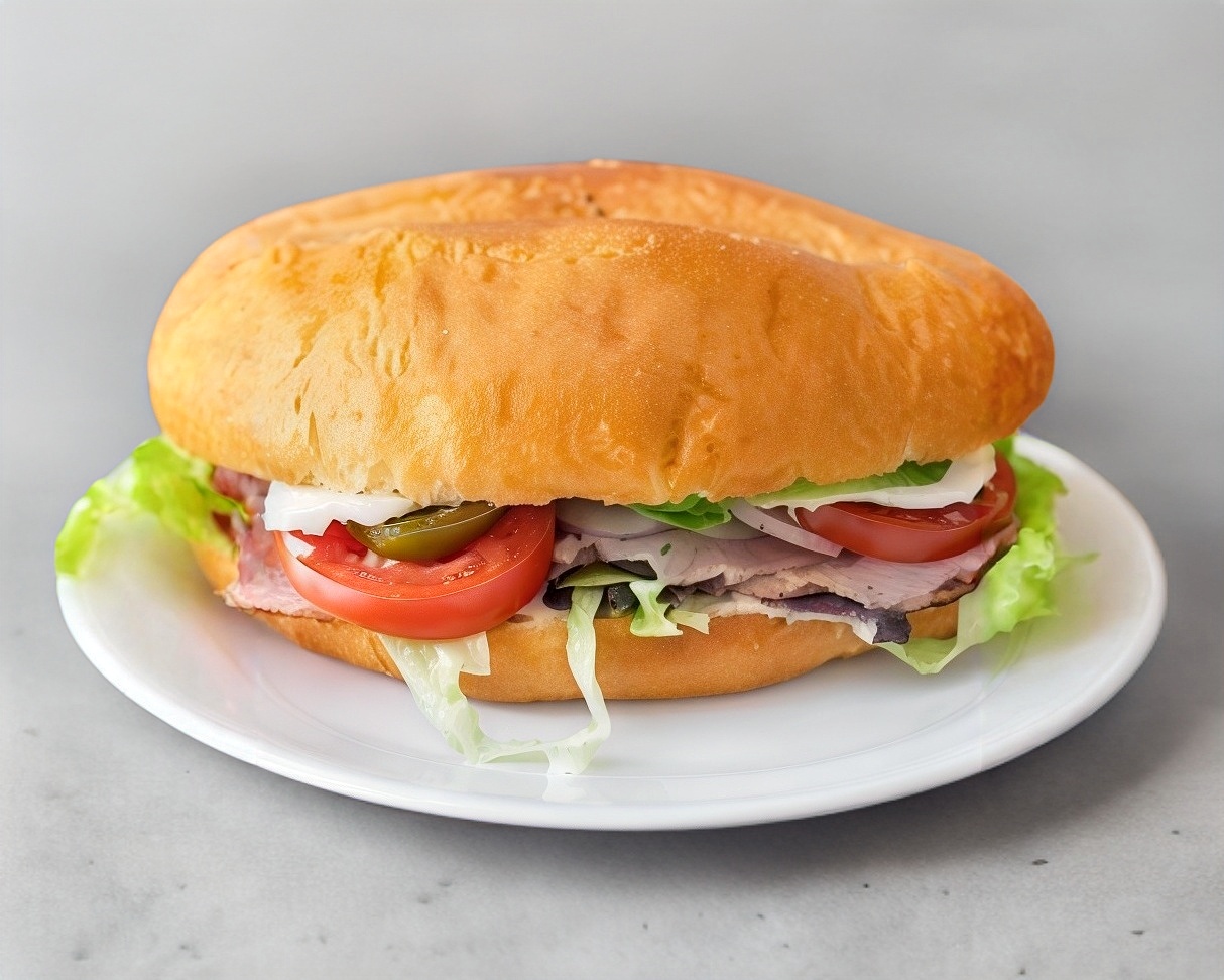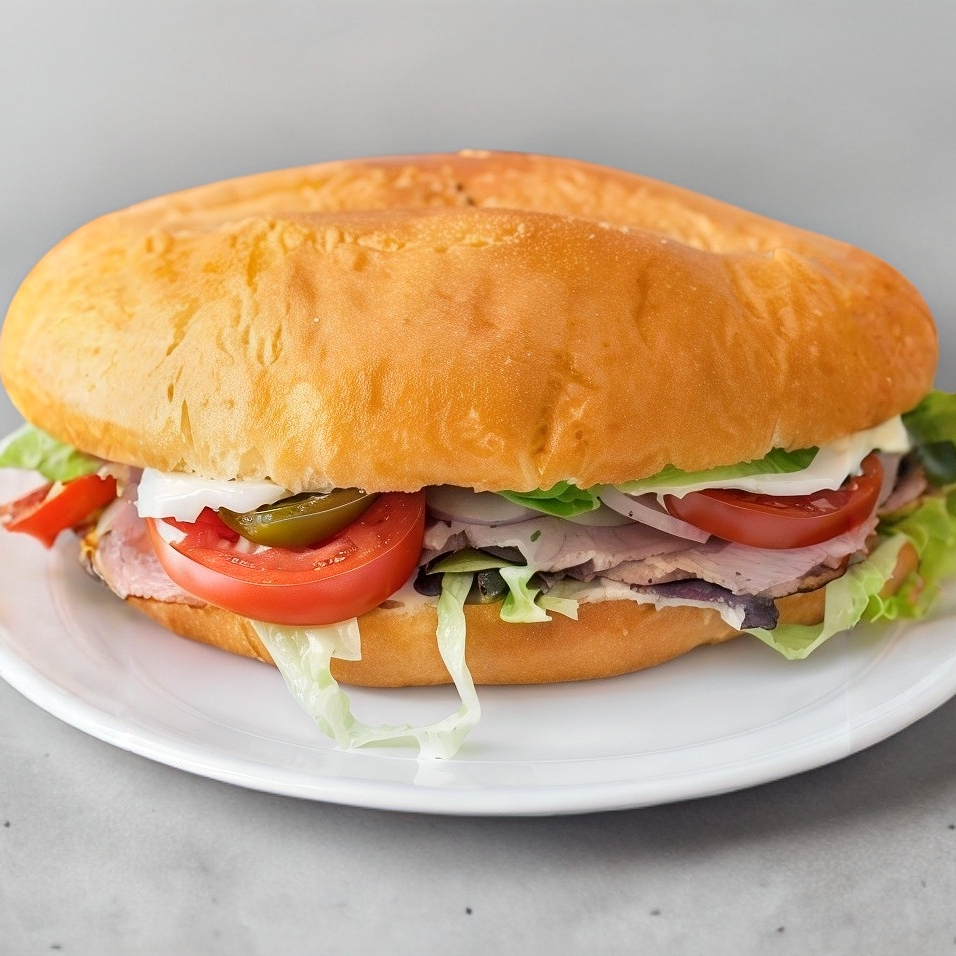 telera rellana de jamon de pavo con jitomate. lechuga, cebolla y chile jalapeño