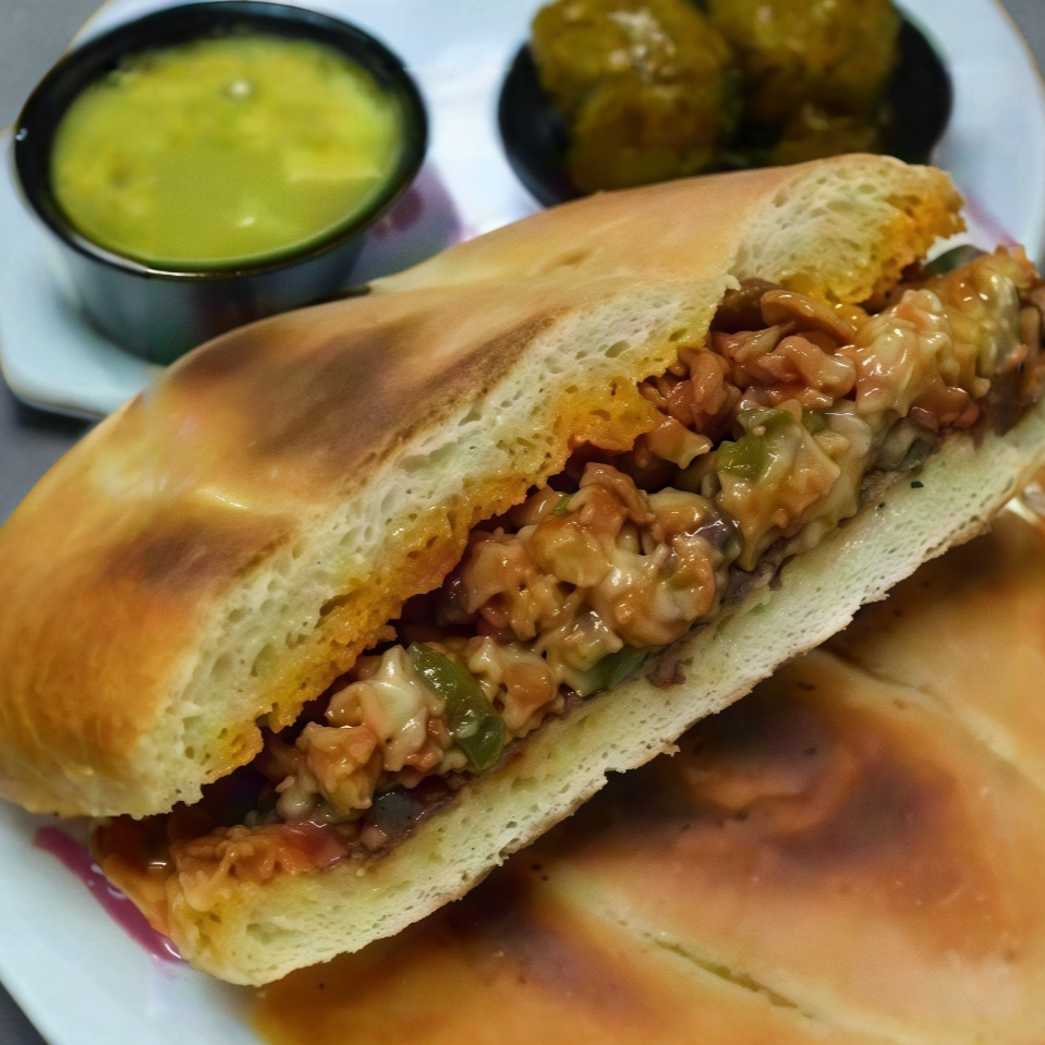Telera untada de frijoles rellenas de carne enchilada, queso amarillo, salchicha frita con jitomate. lechuga, cebolla y chile jalapeño