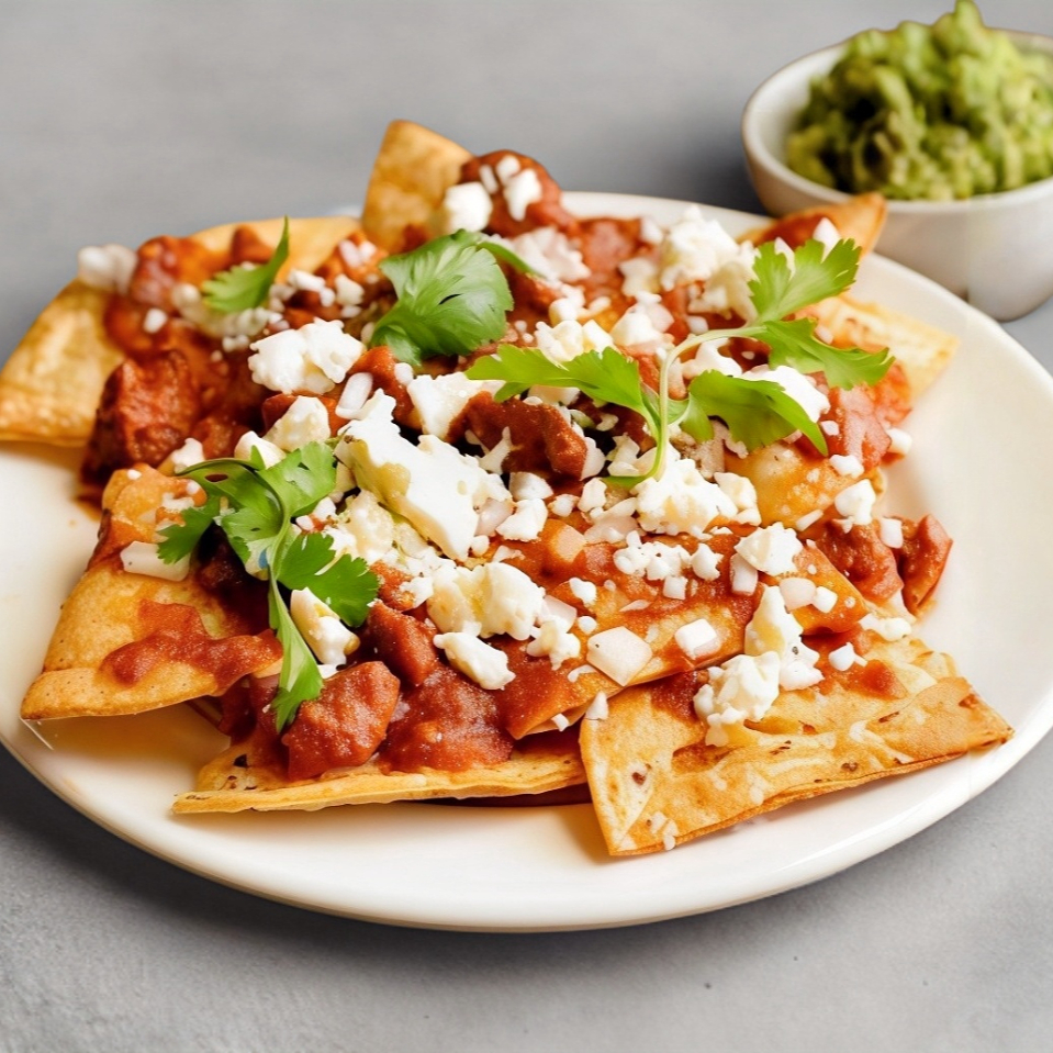 totopos bañados en salsa roja con queso , crema y cebolla ( proteina chorizo corona)