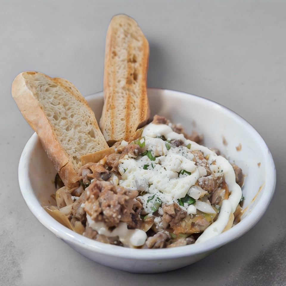 totopos bañados con salsa roja, consome y carne de barbacoa adornados con crema, cebolla, y queso