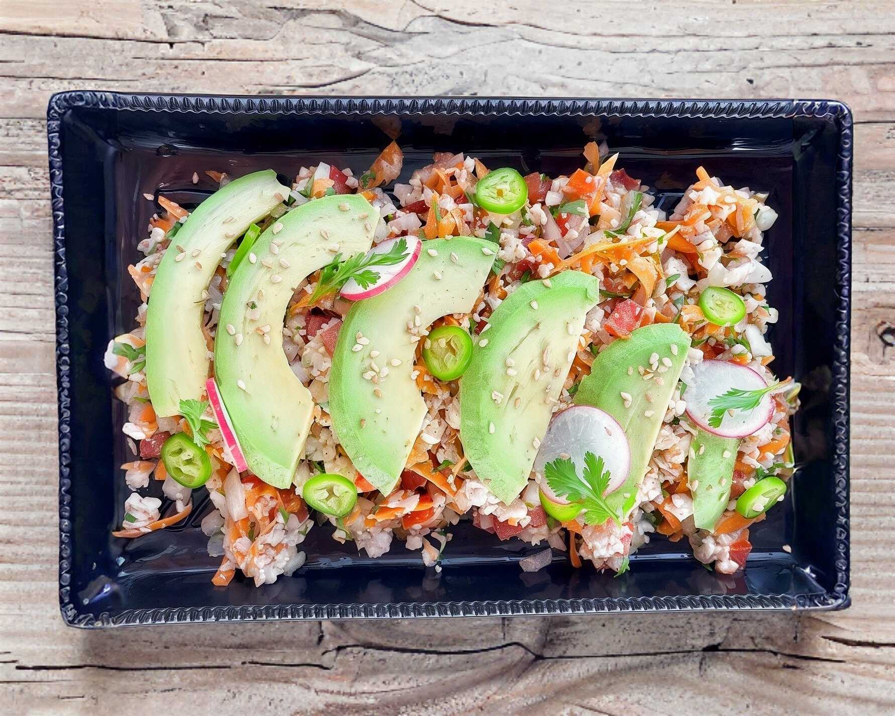 Camarón en cubos, cebolla y pimiento revuelto en queso, aguacate, ensalada de col y zanahoria.
