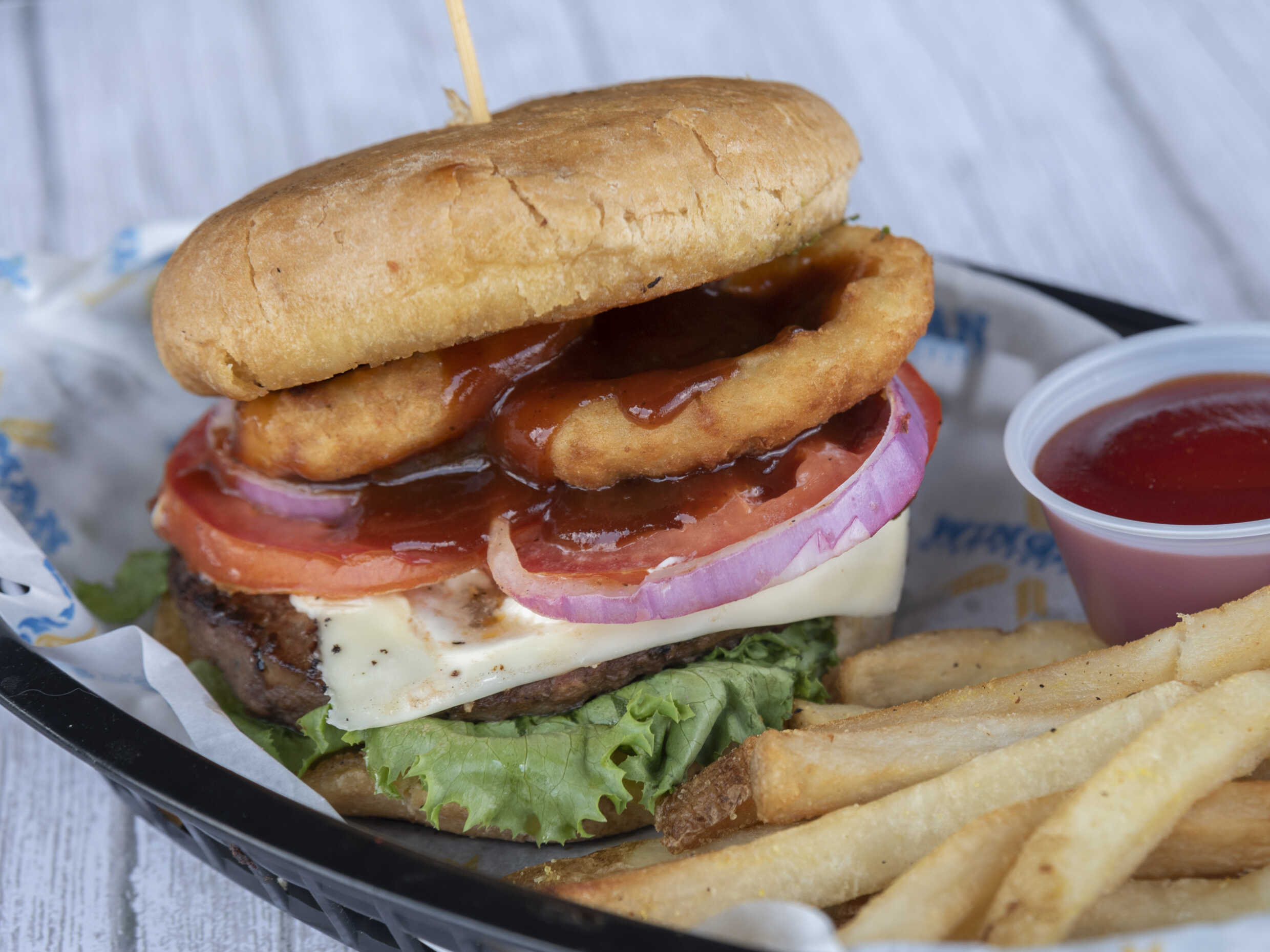 Con carne de res, queso, aros de cebolla, salsa BBQ, tomate, lechuga, pepinillos y cebolla.