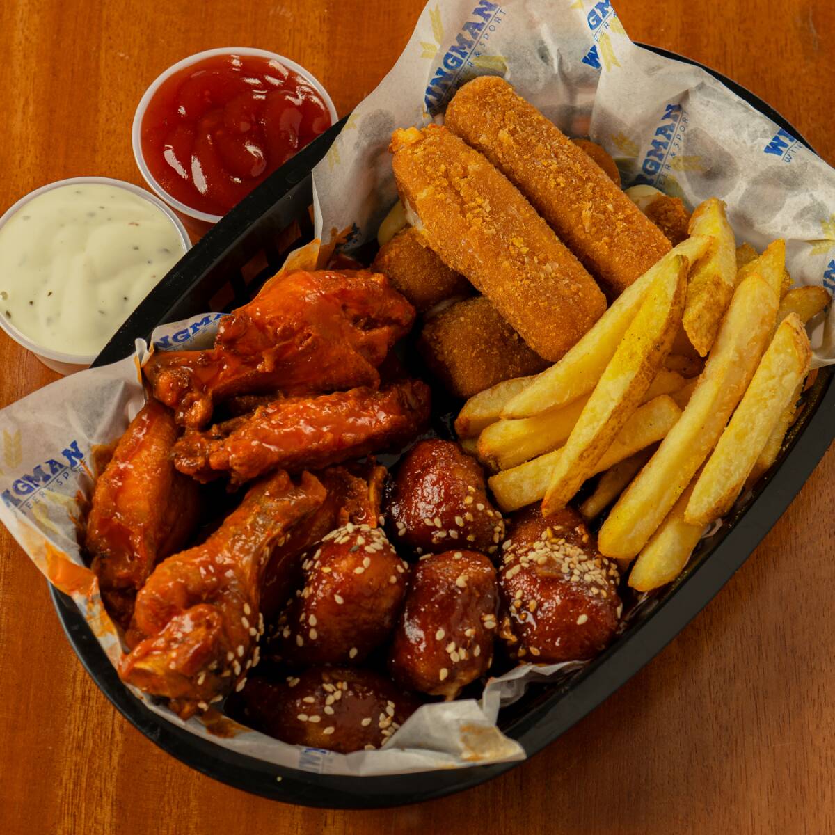 4 Alitas, 4 boneless, 4 dedos de queso y papas a la francesa.