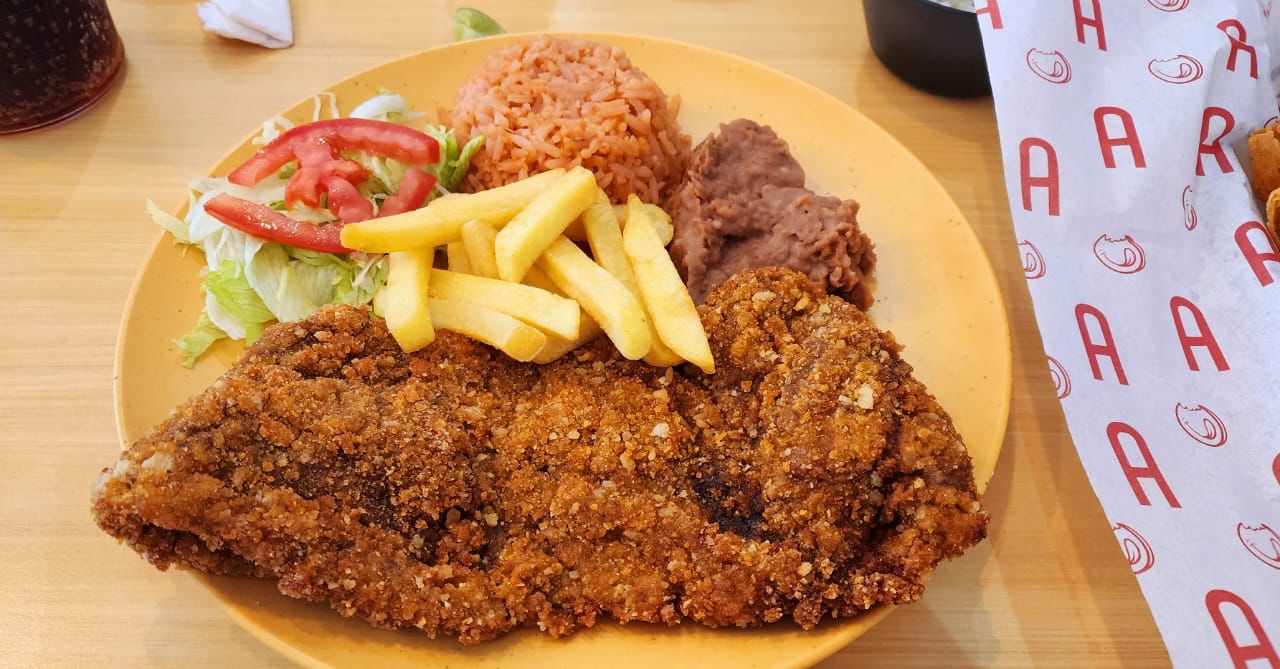 Milanesa de res acompañada de arroz, frijoles, ensalada, tortillas y papas fritas.