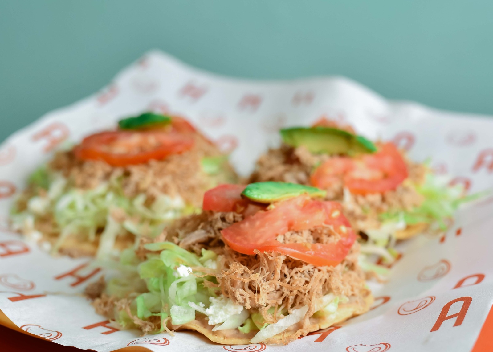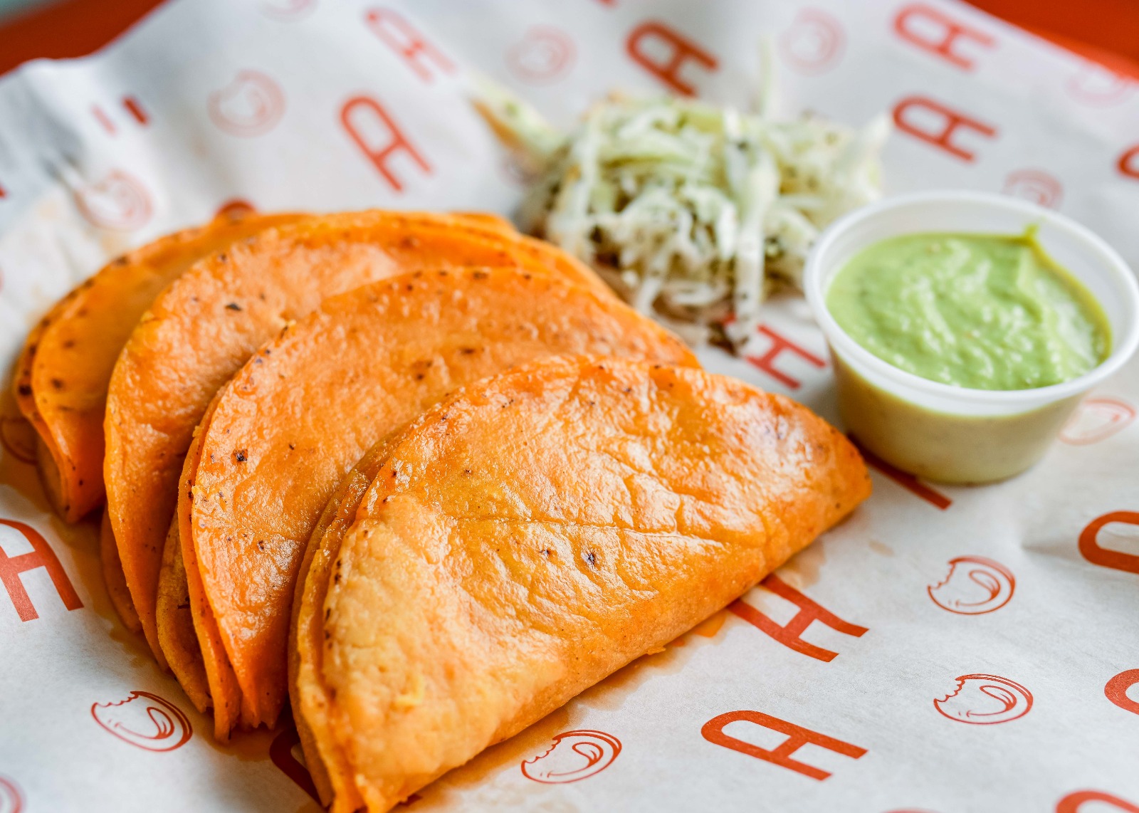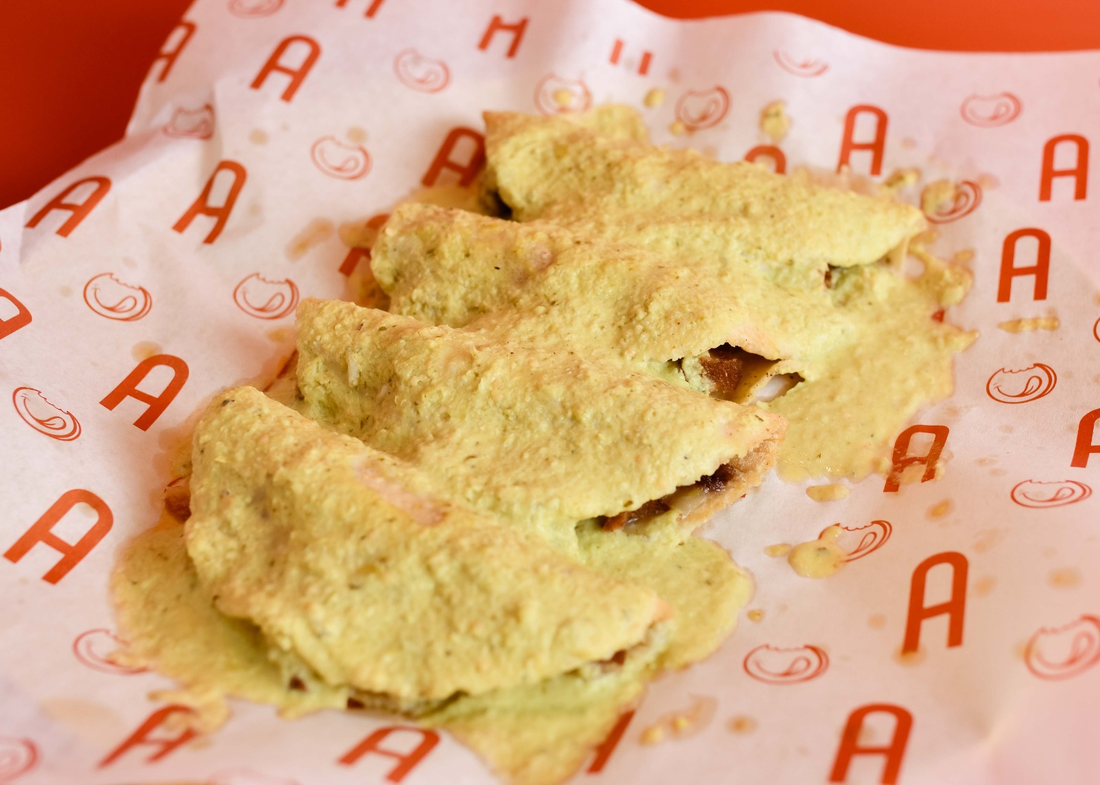 Taco de maíz con chicharrón de la ramos, bañado con salsa de yogurt.