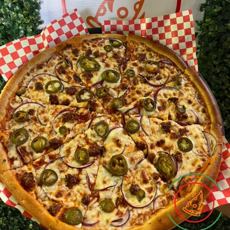 Deliciosa Pizza Mexicana choriza, cebolla morada y jalapeno.