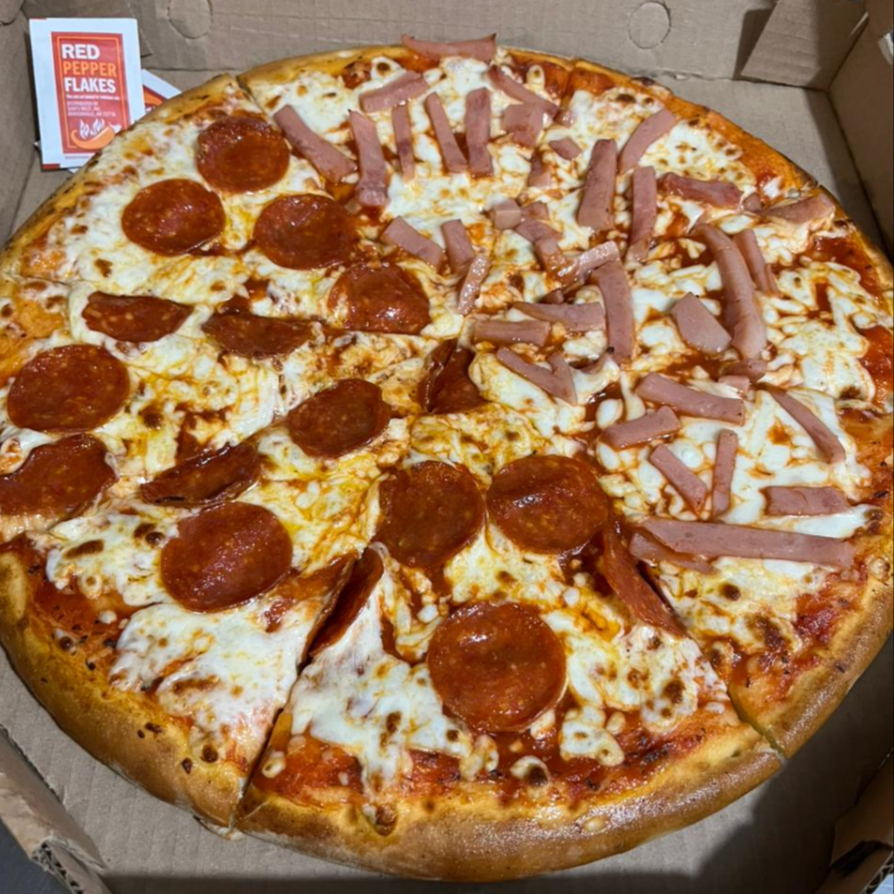 deliciosa pizza mitad y mitad de 1 ingrediente a elegir entre pepperoni jamon o queso
