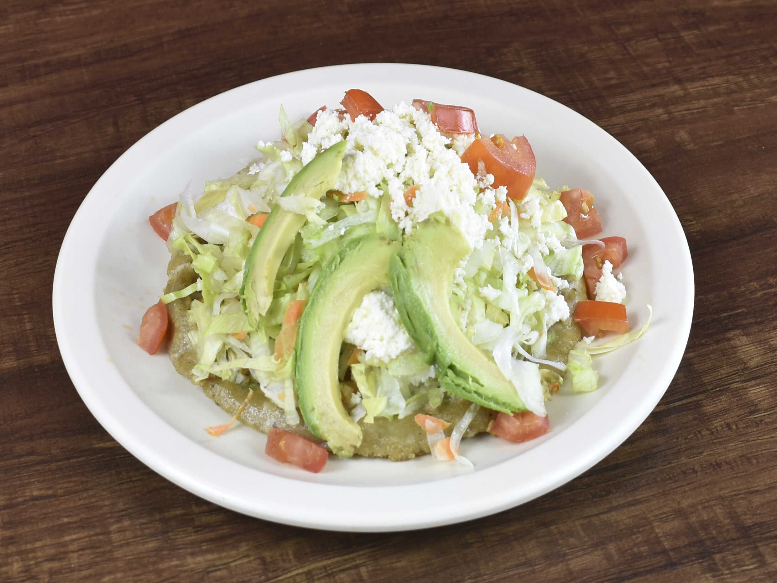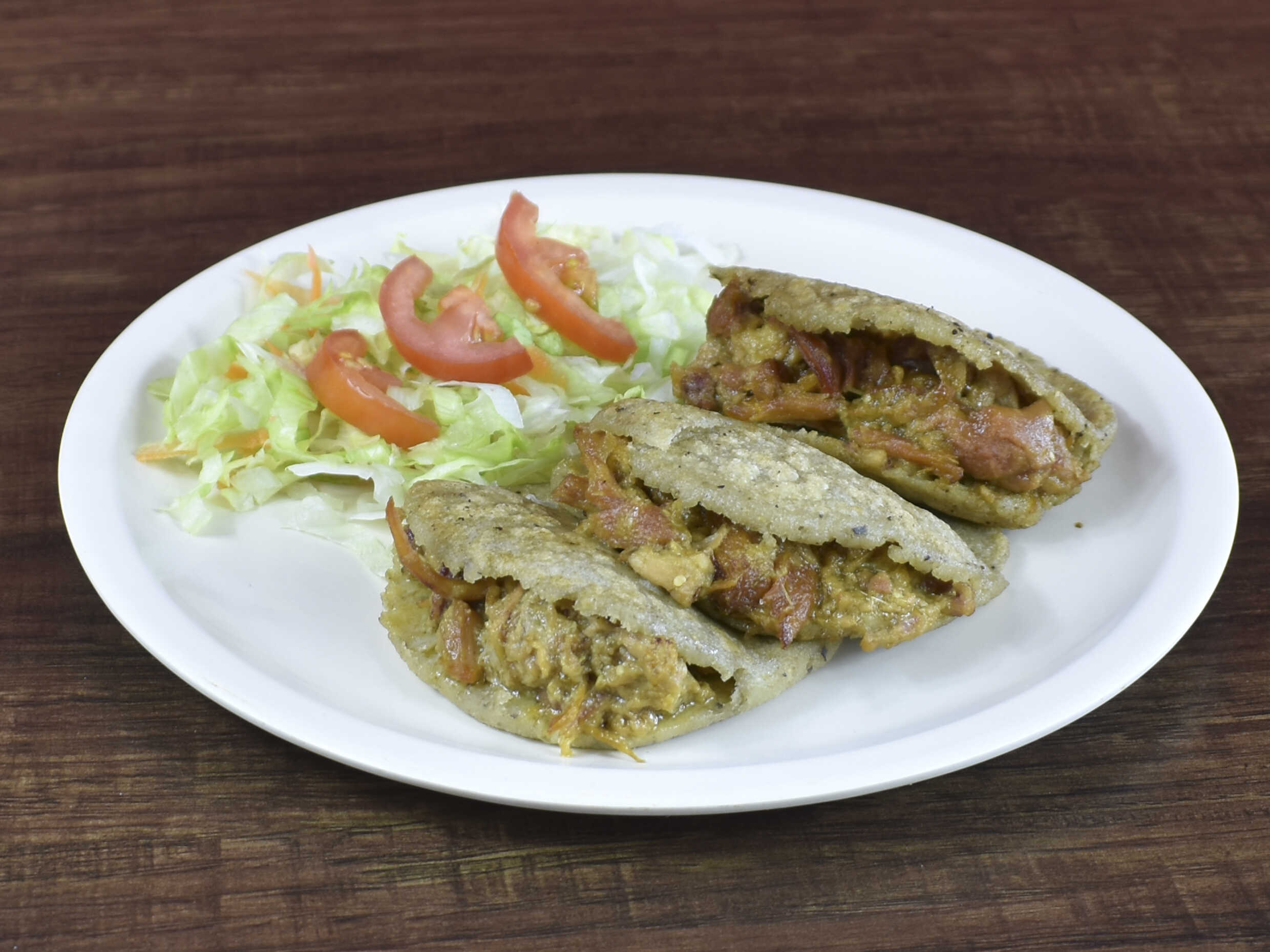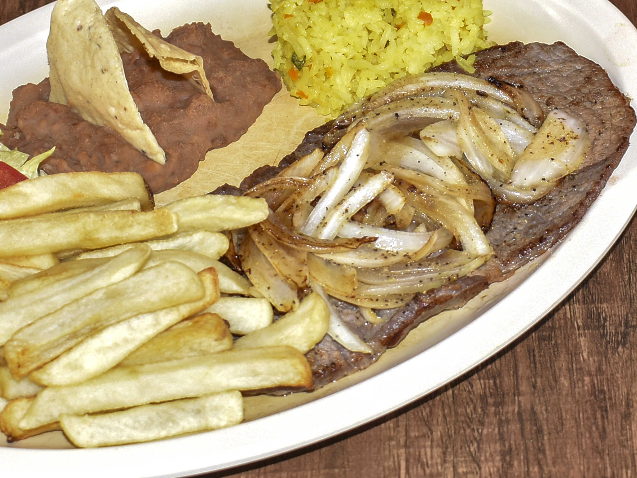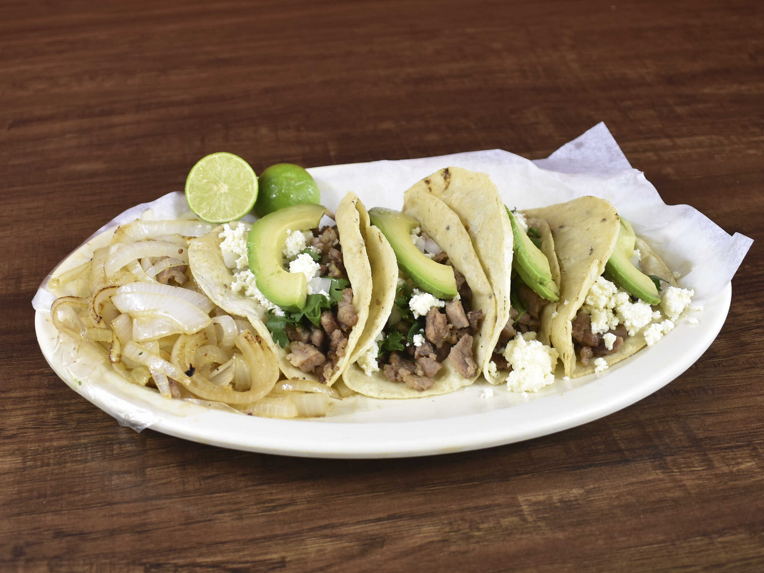 Con bisteck, aguacate y queso. Acompañado de tortillas de maíz.