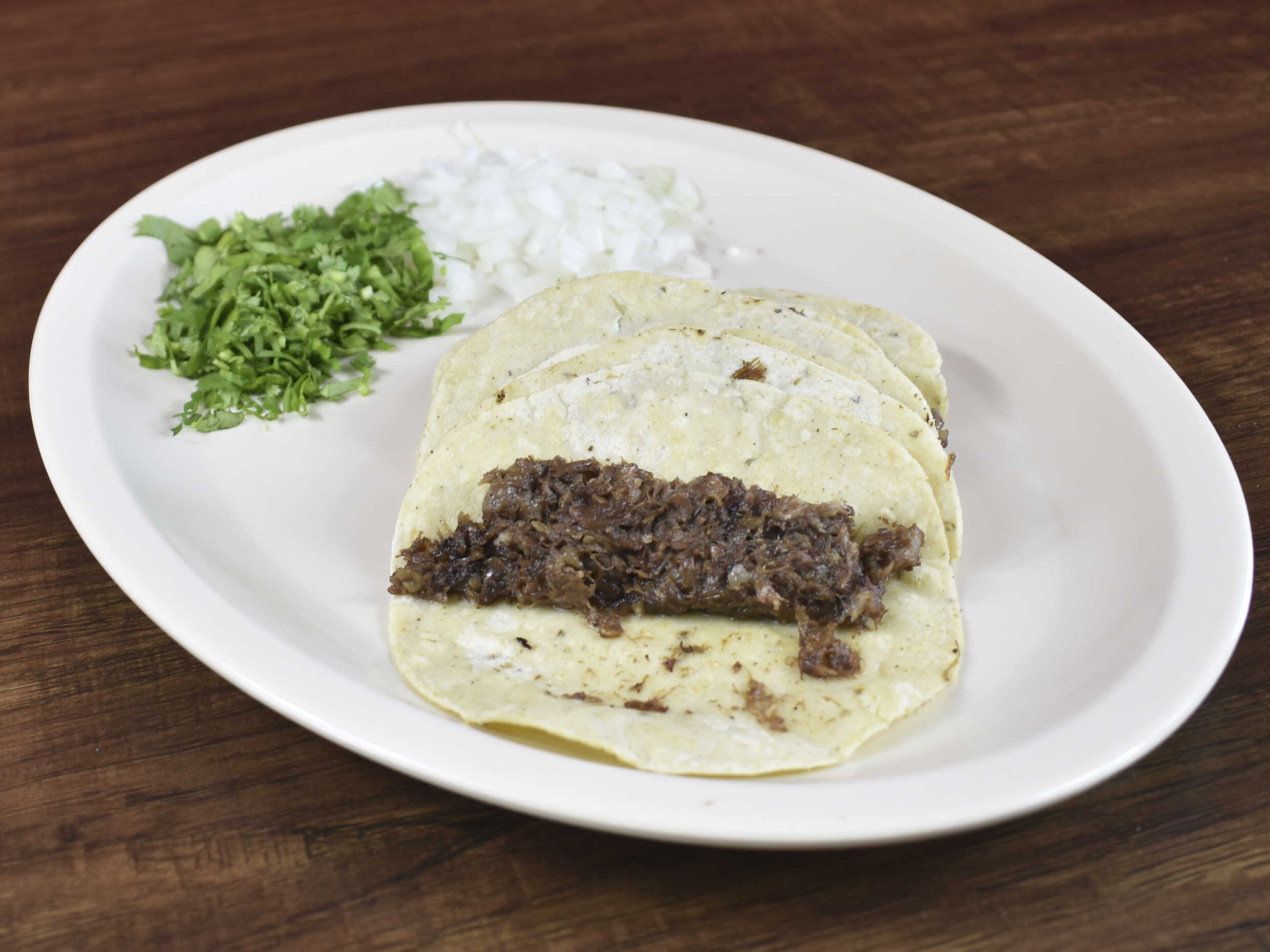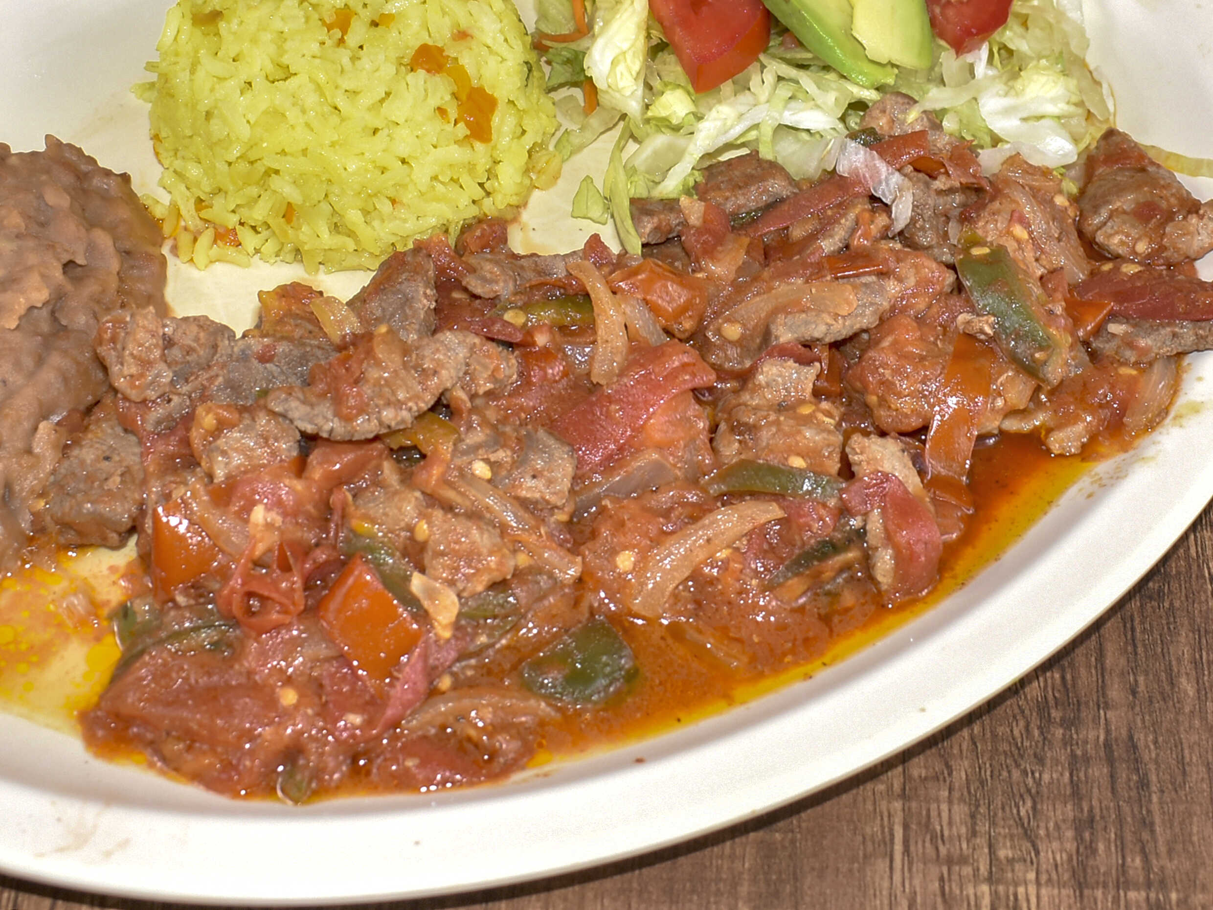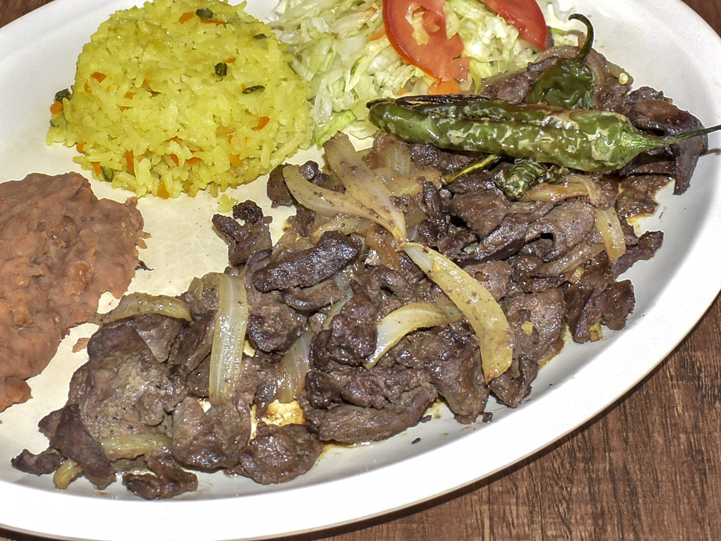 Con bisteck, aguacate y queso. Acompañado de tortillas de maíz.
