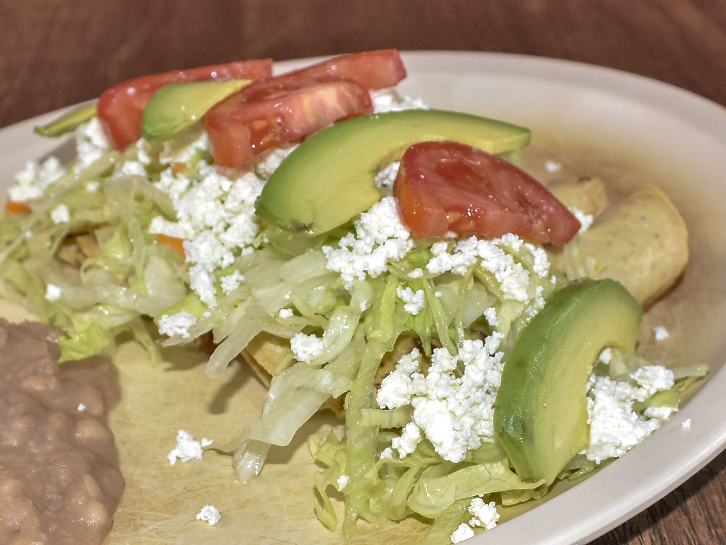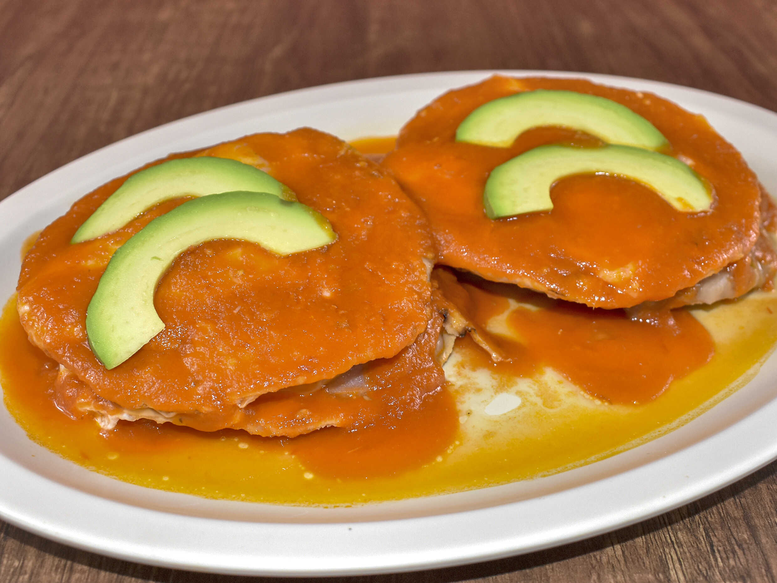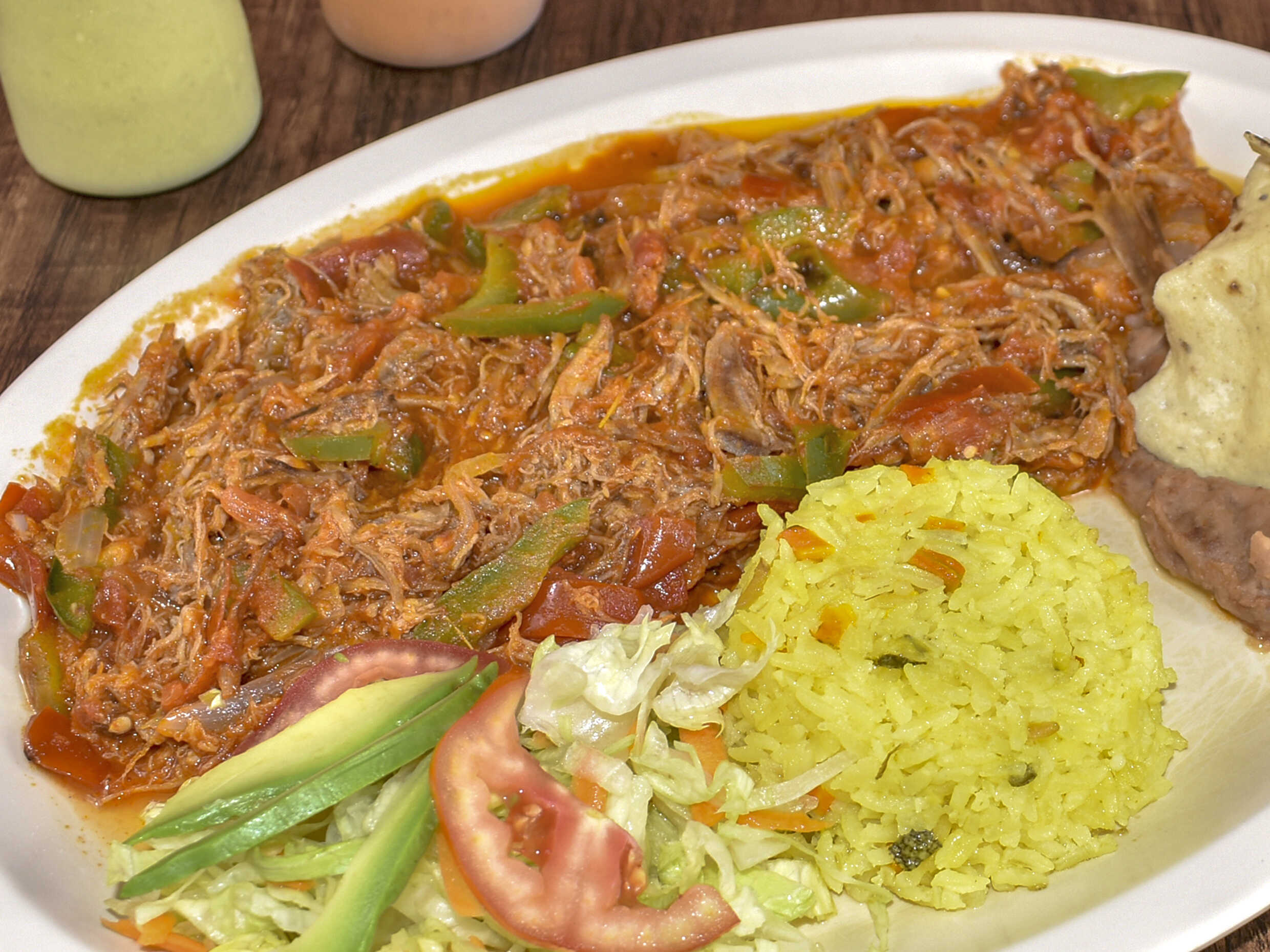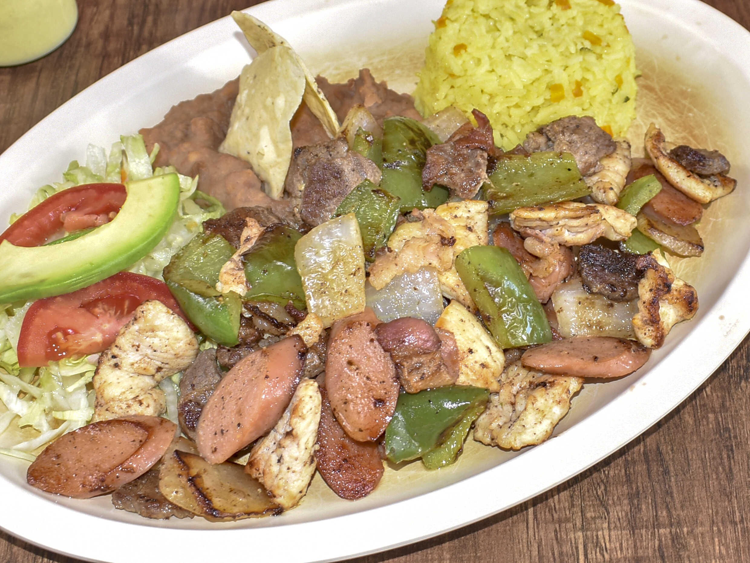 Con bisteck, aguacate y queso. Acompañado de tortillas de maíz.