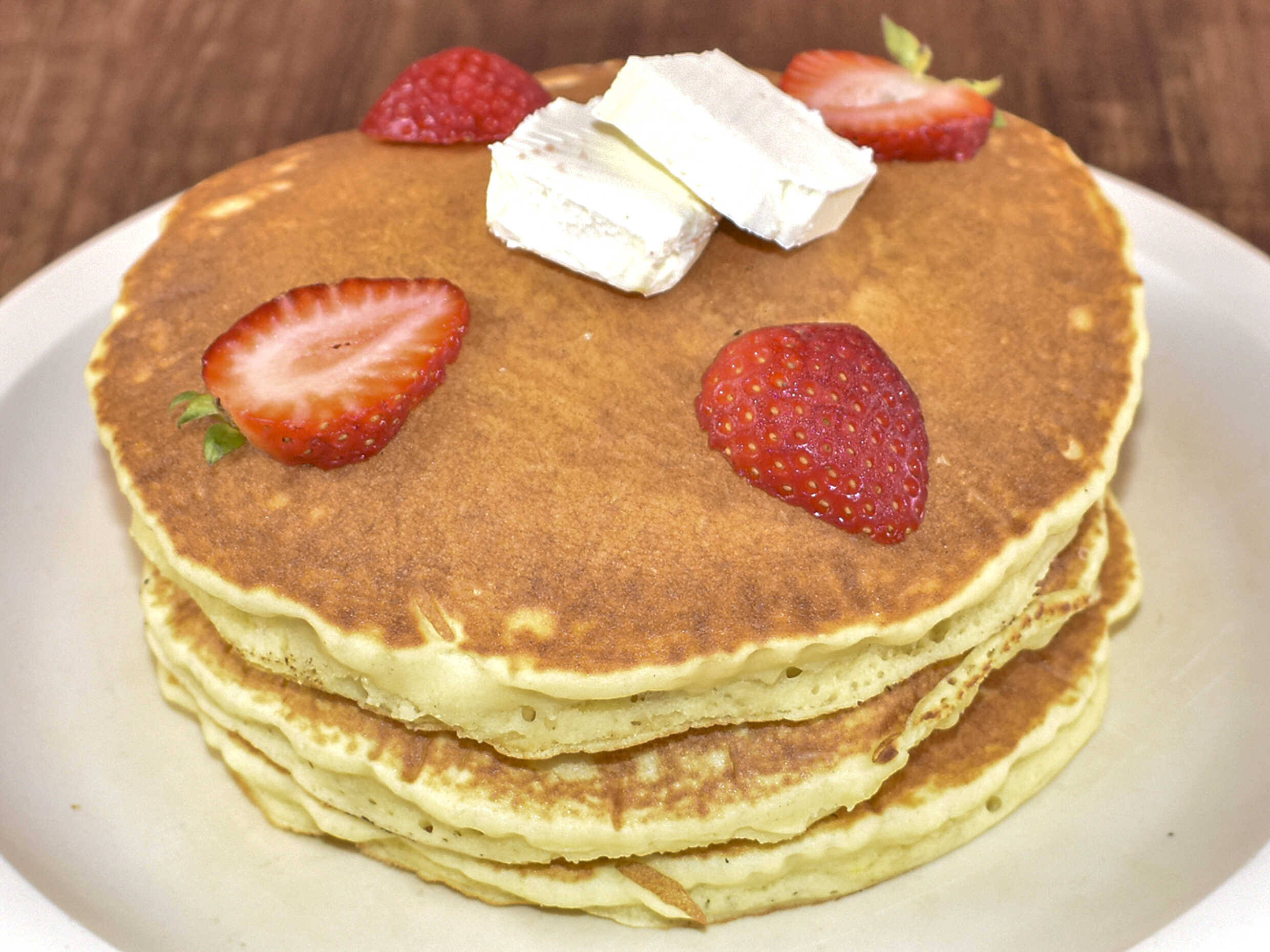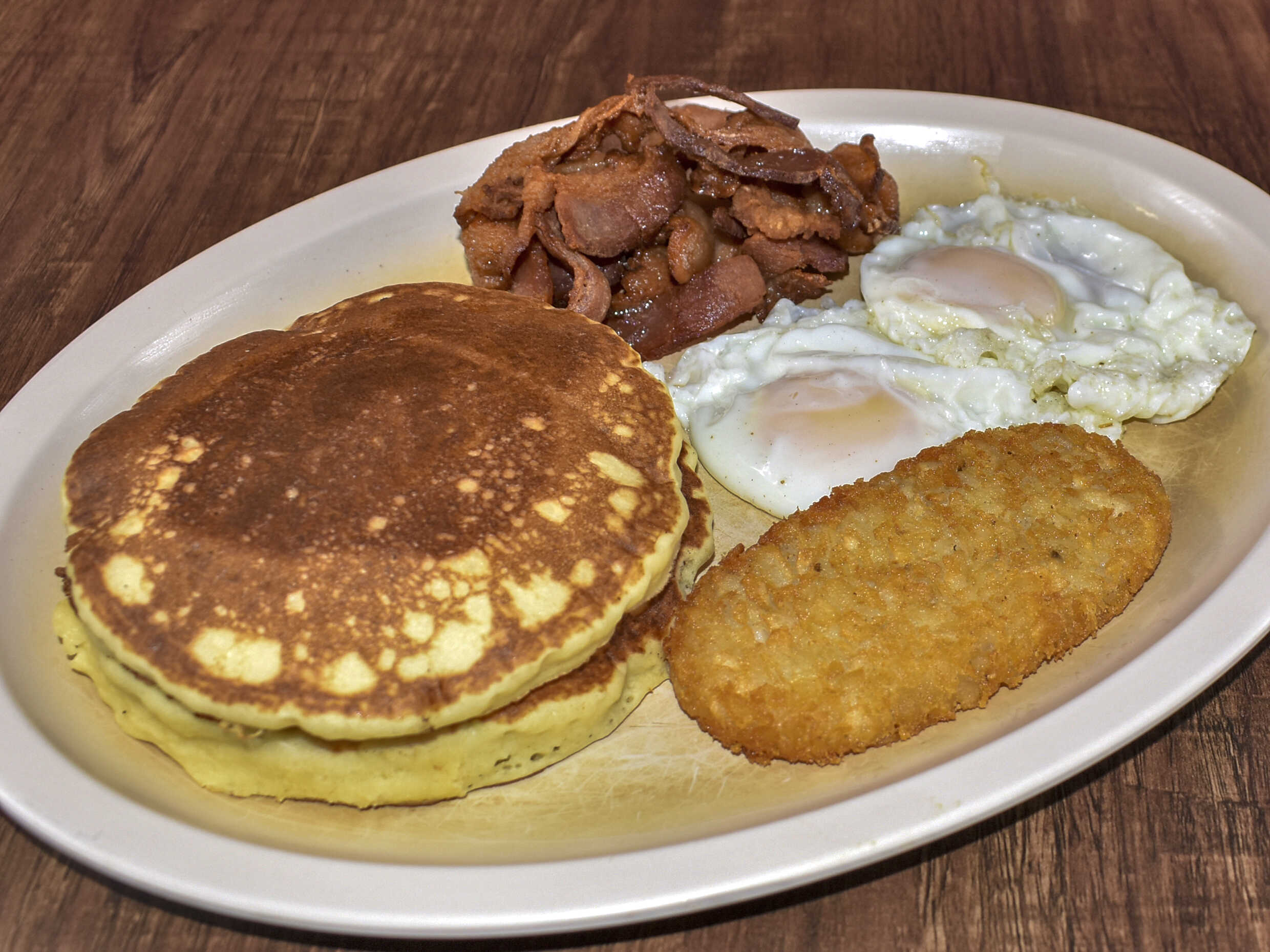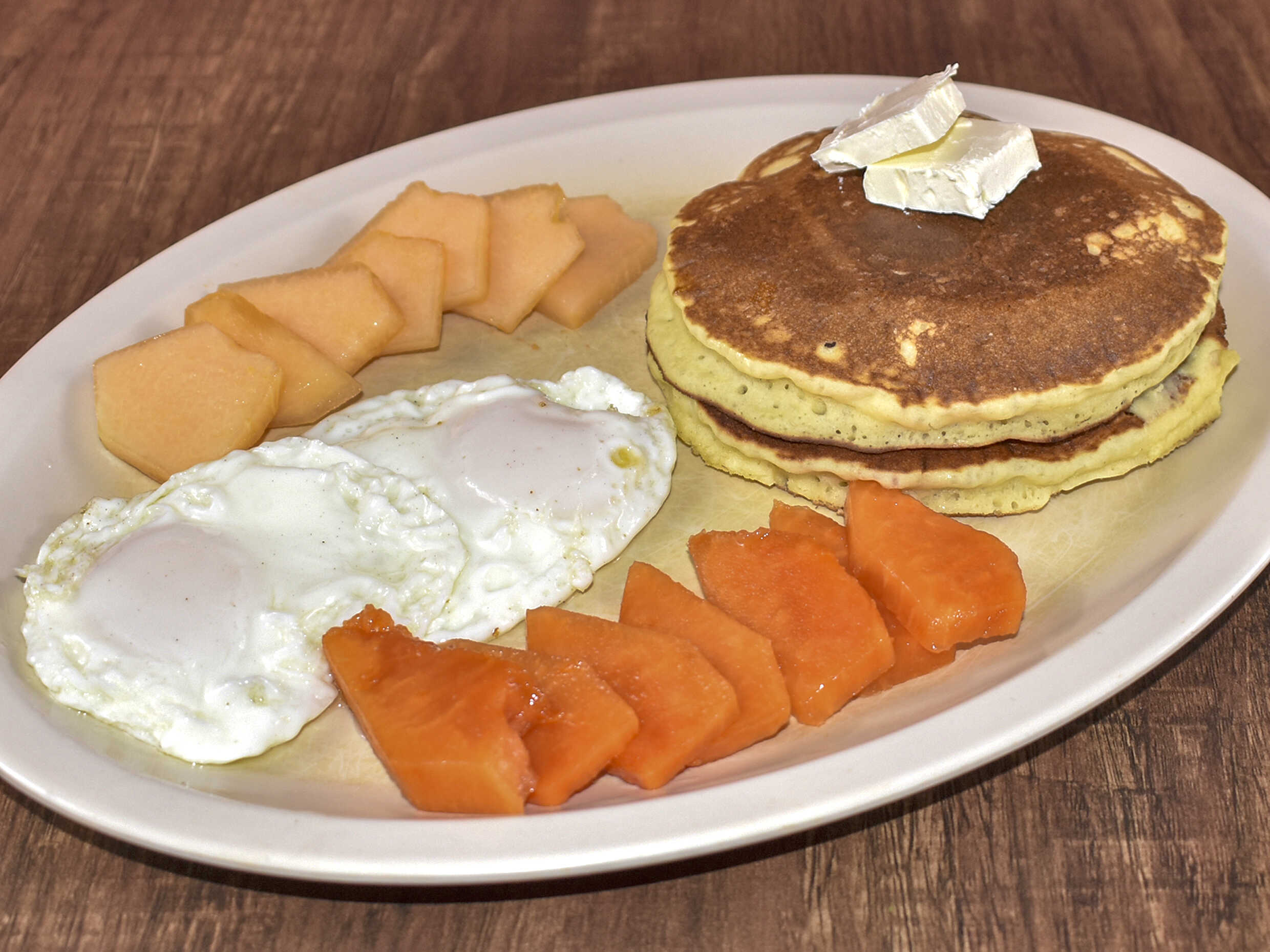 Incluye 2 hot cakes, fruta y dos huevos al gusto.