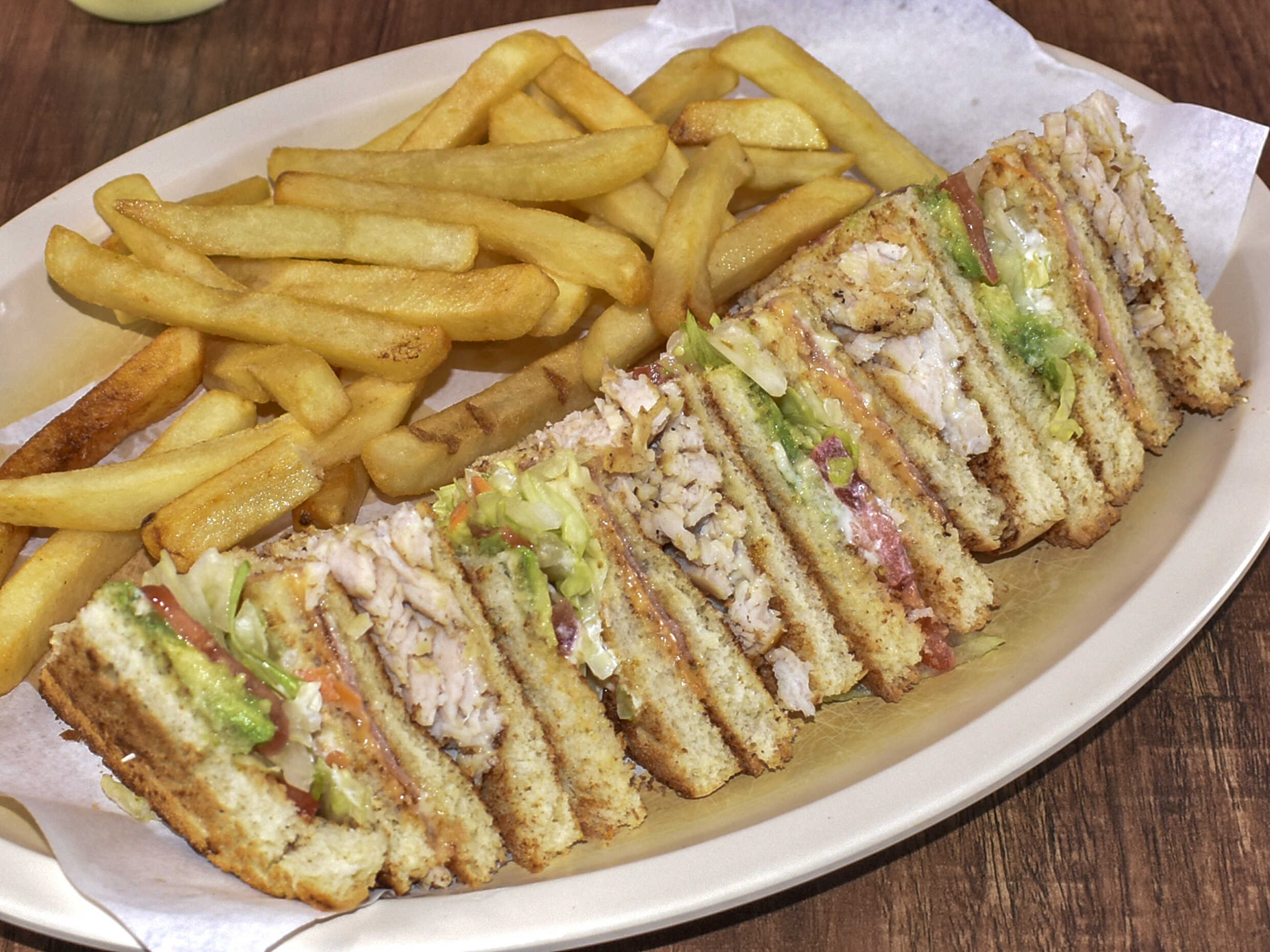 1 Sandwich con jamón, pechuga, aguacate, lechuga, tomate y queso amarillo, acompañado de papas fritas. (Porción personal)
