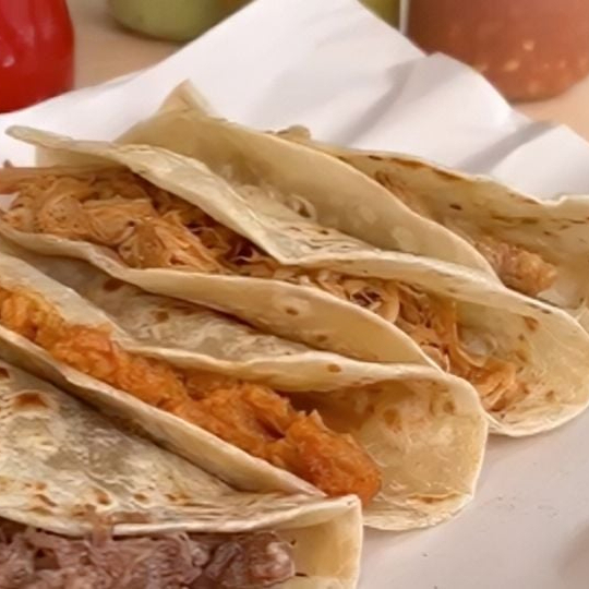 Taco de maíz con adobo más guiso, verdura, salsa y limón
