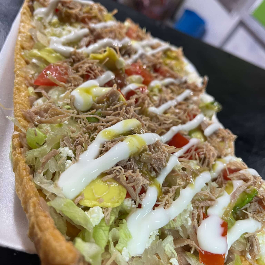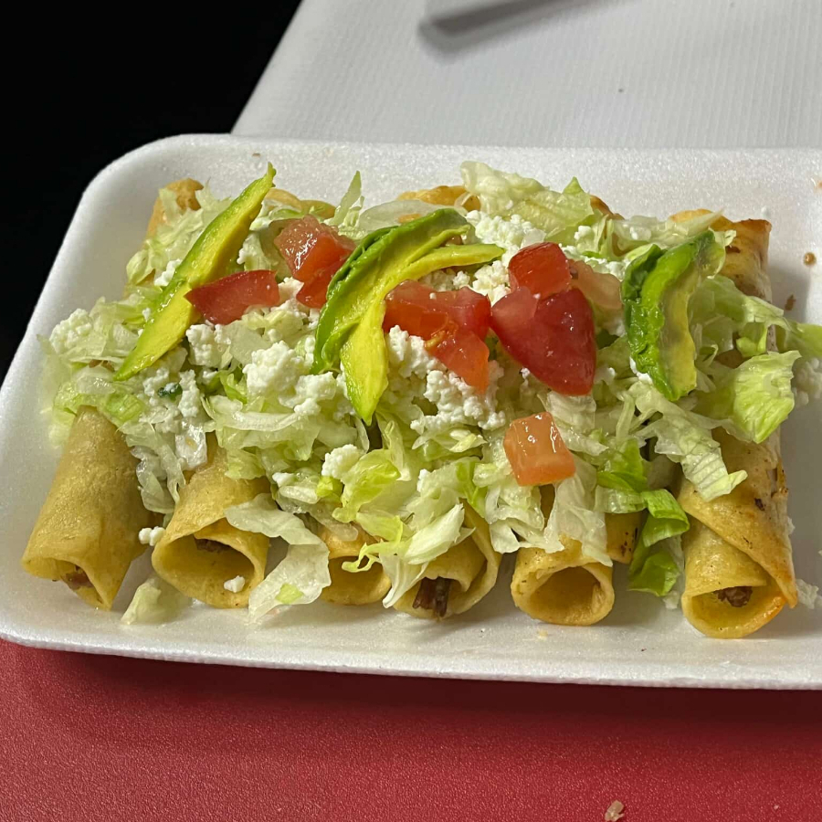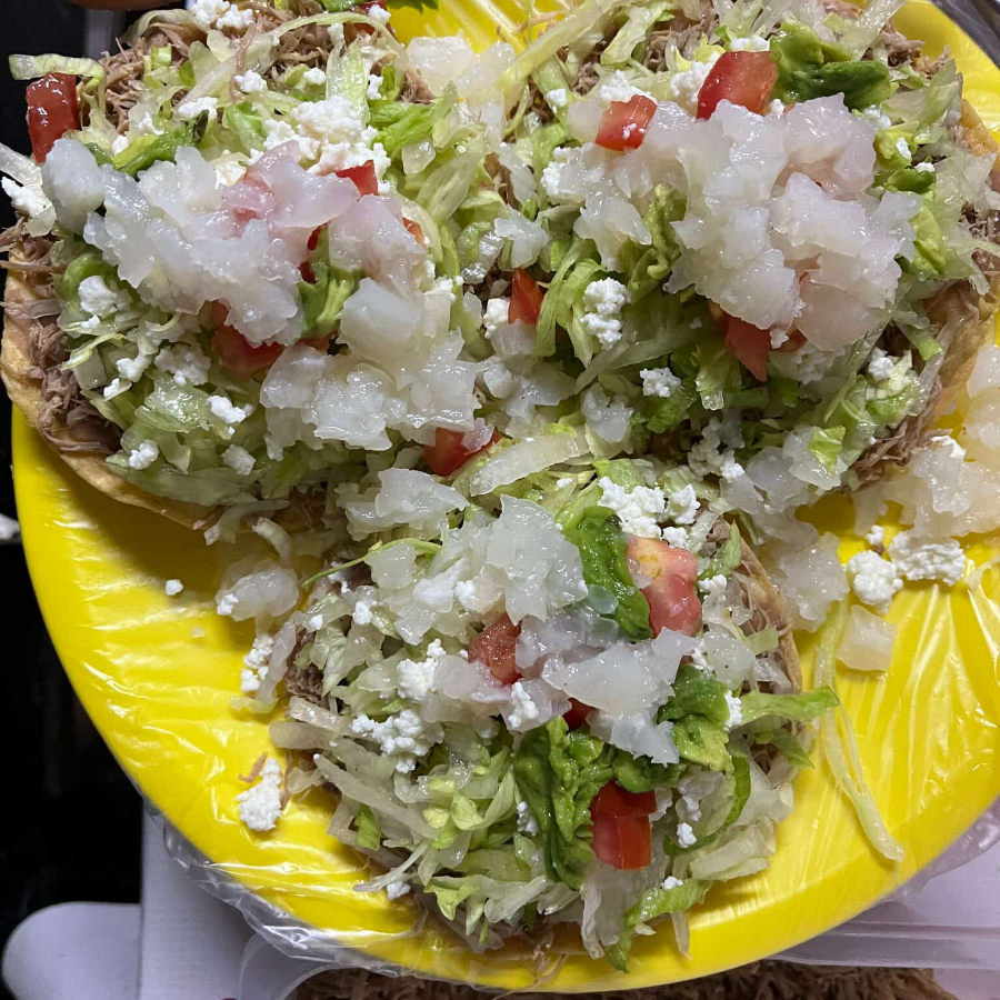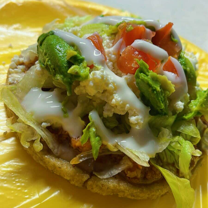 tortilla de maiz, rellena de deshebrada de res natural, acompañadas de lechuga, tomate,aguacate, queso fresco y cueritos en vinagre.