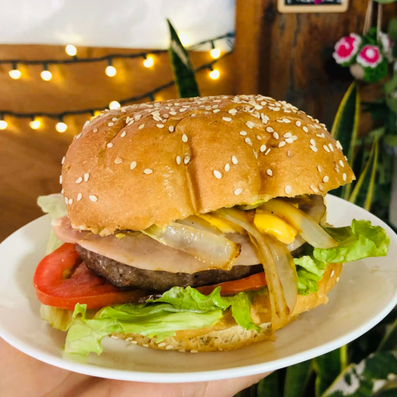 Carne Sirloin, jamon, queso americano, cebolla caramelizada, lechuga, tomate, mayonesa, mostaza y catsup