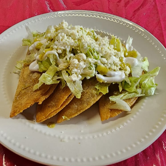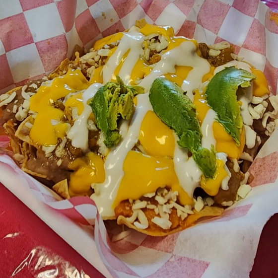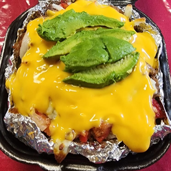 TOTOPOS CON FRIJOLES, QUESO MOZARELLA, CARNE, QUESO CHEDDAR, CREMA Y AGUACATE