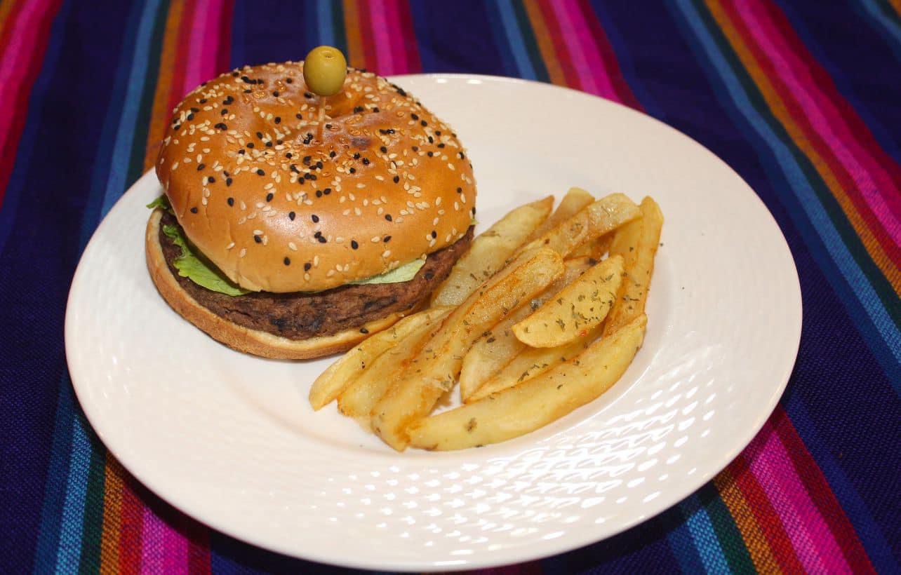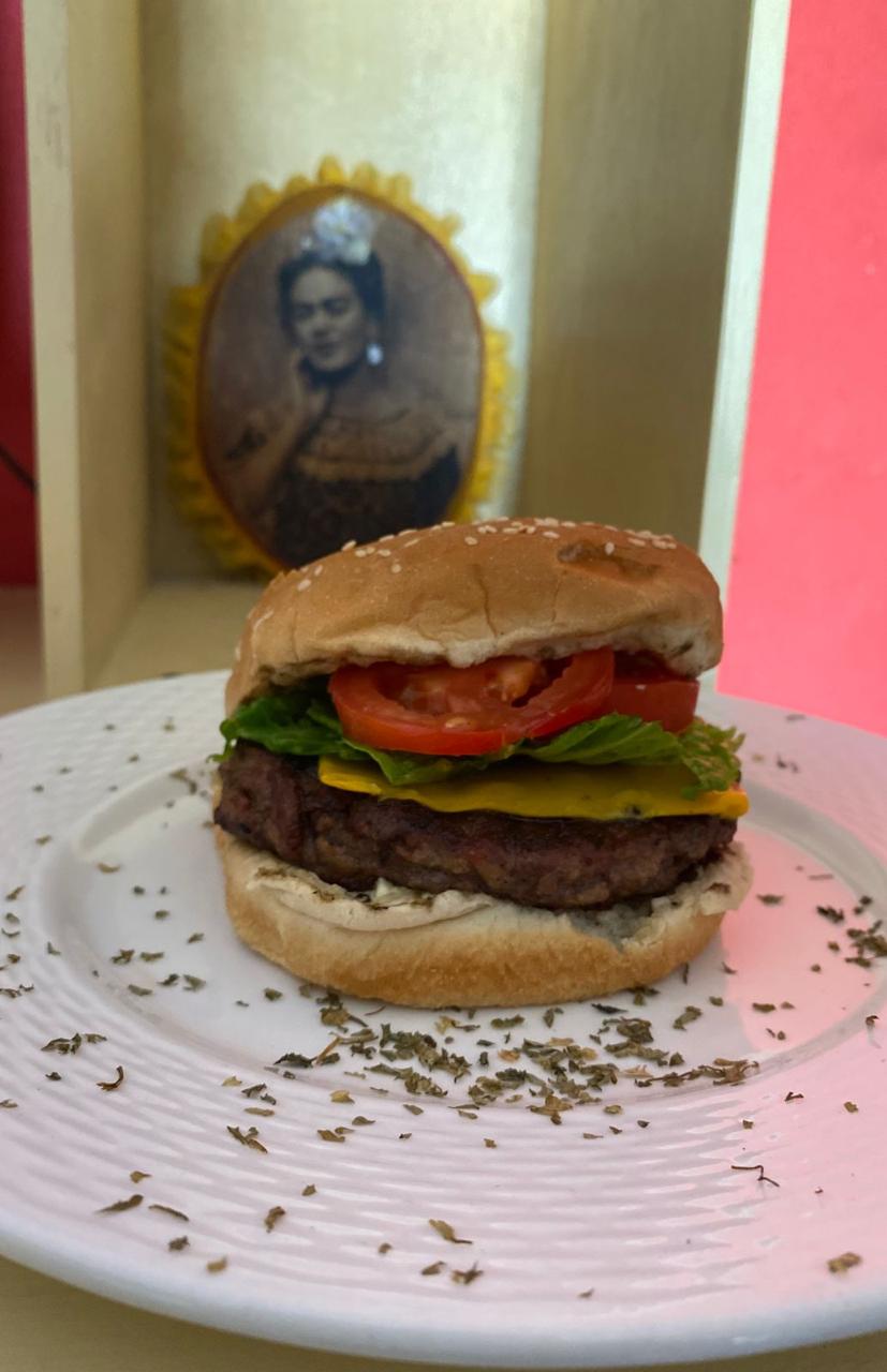 Deliciosa carne de hamburguesa con queso amarillo, lechuga, tomate y pepinillos.