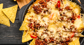 Totopos con carne asada, frijoles, queso amarillo y pico de gallo.