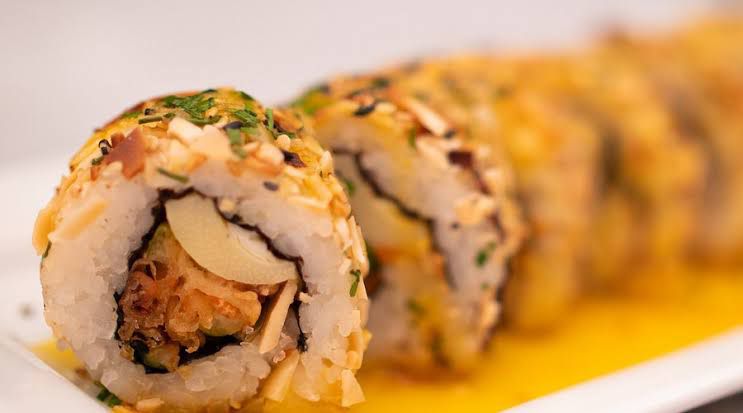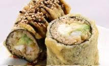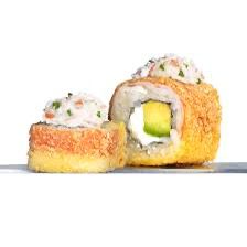 Arroz frito, queso crema, aguacate, camarón empanizado.