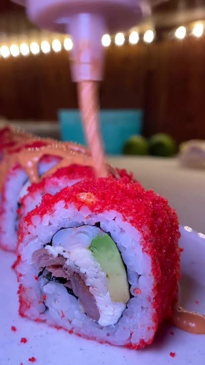 Queso crema, aguacate, surimi, tampico, envuelto en cheetos flaming hot.