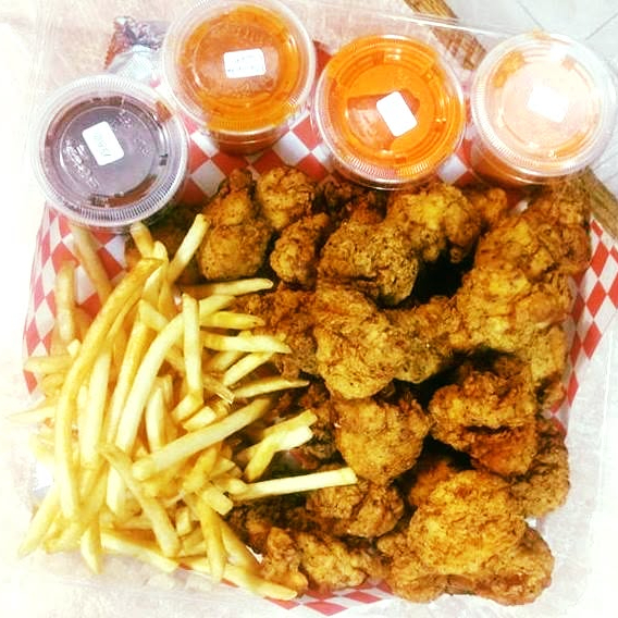 Trozos de pechuga de pollo crujientes, bañados en tu salsa favorita y papas fritas