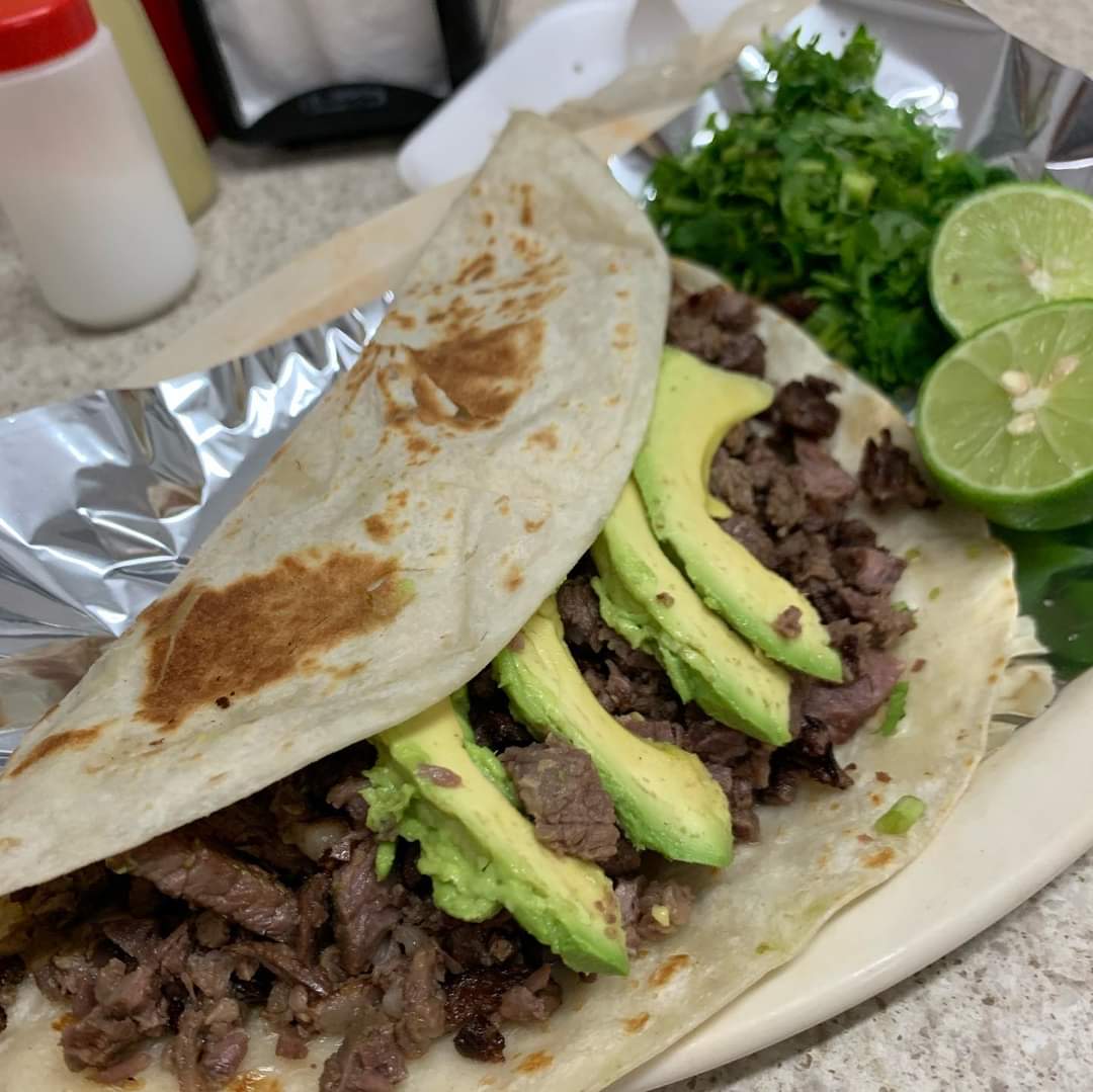 TORTILLA DE HARINA GRANDE, CARNE, CEBOLLA,CILANTRO,QUESO ASADERO,AGUACATE,CEBOLLA ASADA