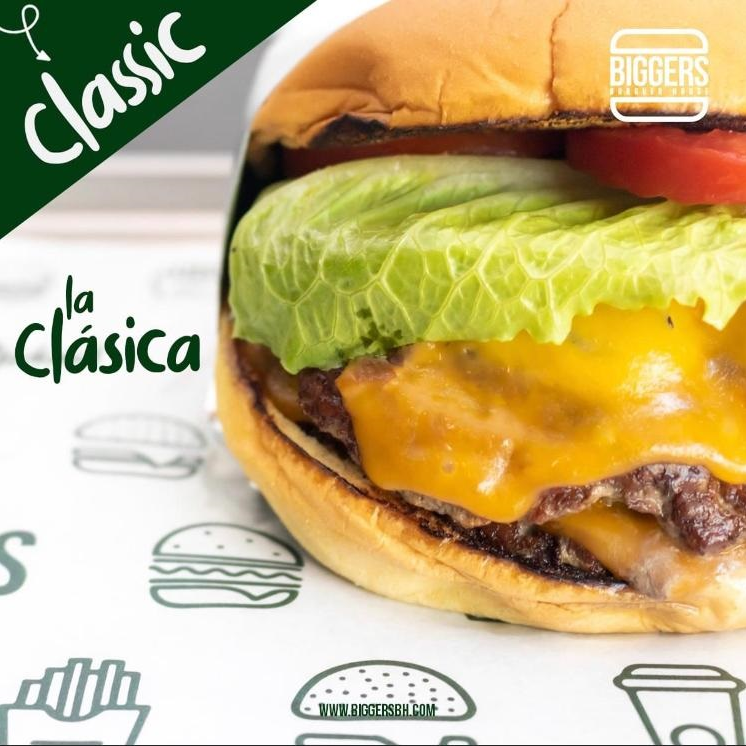 Carne angus certificada de 180g(aprox.), Lechuga, Tomate, Cebolla, Aderezo de la casa, queso Americano.