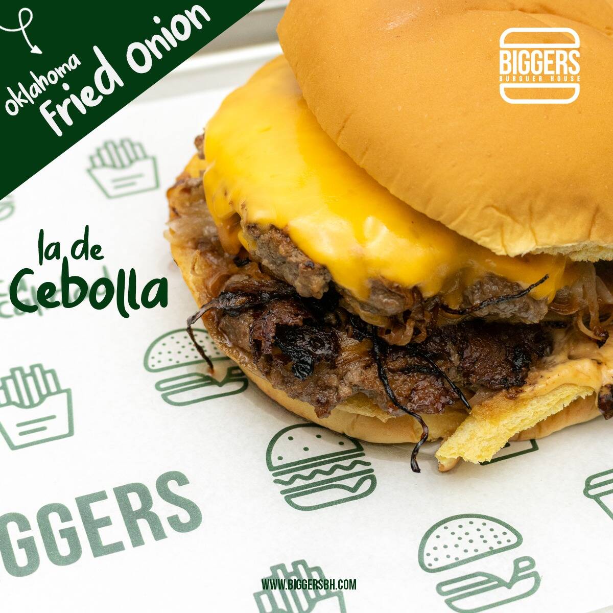 Carne angus certificada de 180g(aprox.), Aderezo de la casa, queso Americano, cebolla caramelizada.