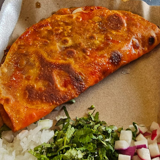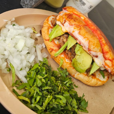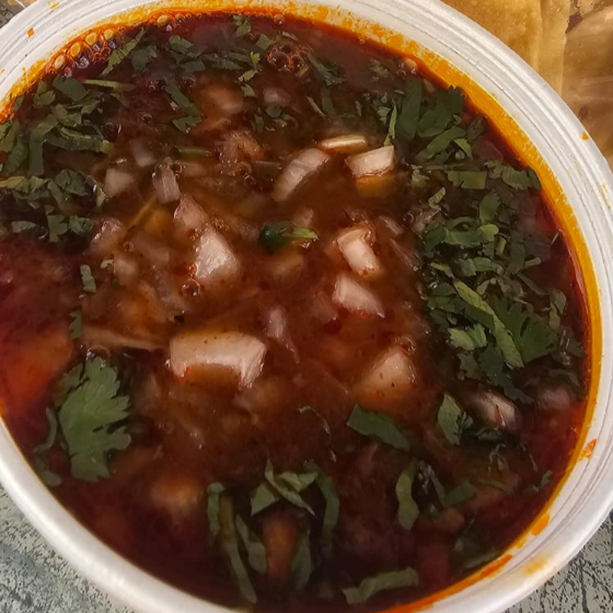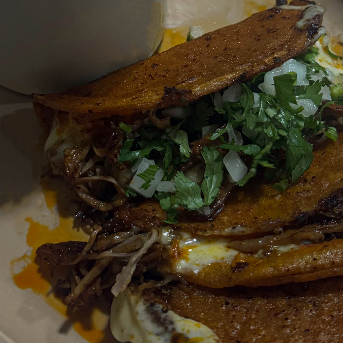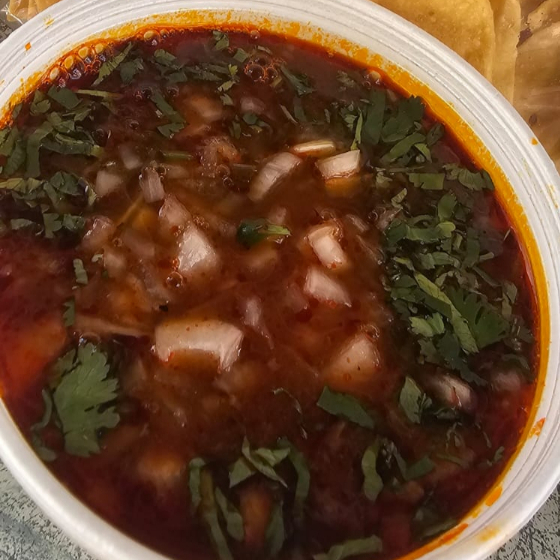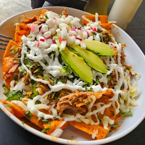 Totopos y birria en su jugo con queso asadero, cilantro, cebolla y aguacate.