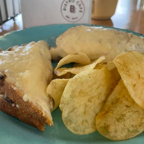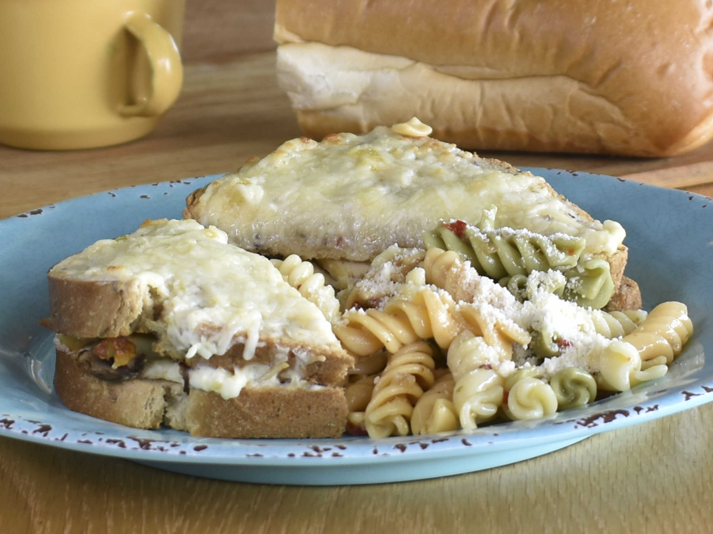 Queso crema con piña, champiñones, queso suizo, cubierto de queso provolone, queso asiago, parmesano y romano en pan tajado integral. 1 Guarnición: Ensalada, papas o pasta fría rotini.