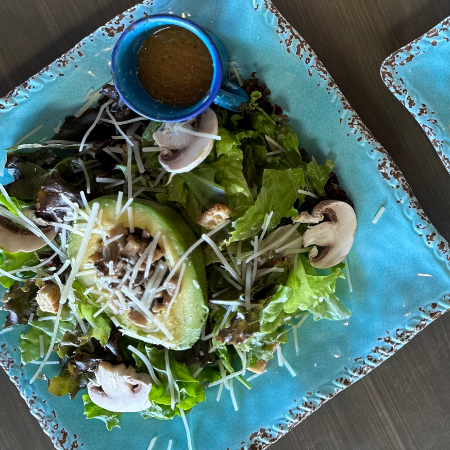Aguacate relleno de champiñones al ajillo, servido sobre cama de lechuga.