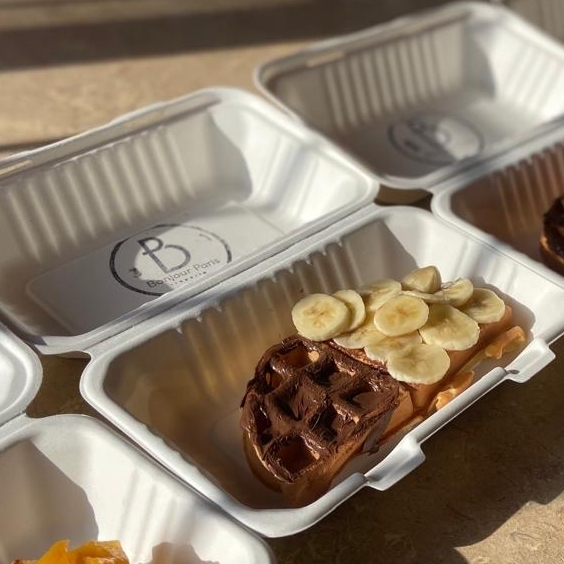 Waffle con una cubierta de abundante Nutella y dos frutas a escoger